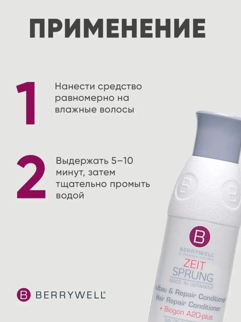 Кондиционер восстанавливающий мгновенного действия Hair Repair Express 61 мл. Кондиционер Berrywell Hair Repair Conditioner отлично действует в комплексе с шампунем из одноимённой серии, восстанавливая сухие, ослабленные или поврежденные после технических процедур волосы. Благодаря средству локоны вновь обретают эластичность, здоровый вид и блеск, и легко расчёсываются.Интенсивная формула запускает процессы регенерации и заполняет повреждения в структуре, борется с тусклостью, ломкостью и появлением секущихся кончиков, возвращает прядям гладкость и мягкость.Экстракт сладкого миндаля увлажняет, способствует заживлению повреждений, препятствует потере яркости цвета и дарит волосам сверкающий блеск.Протеины пшеницы насыщают локоны влагой, предотвращая её потерю, и защищают от действия вредных внешних факторов, придают эластичность и мягкость.D-пантенол улучшает структуру, укрепляя и уплотняя локоны, выравнивает поверхность, делает волосы шелковистыми и послушными.Липиды и воск создают невидимую плёнку для защиты от внешних воздействий и придания ещё большей гладкости. UVA и UVB фильтры надёжно предохраняют пряди от вредного действия солнечных лучей.Применение: нанести средство равномерно на влажные волосы, выдержать 5–10 минут, затем тщательно промыть водой.
