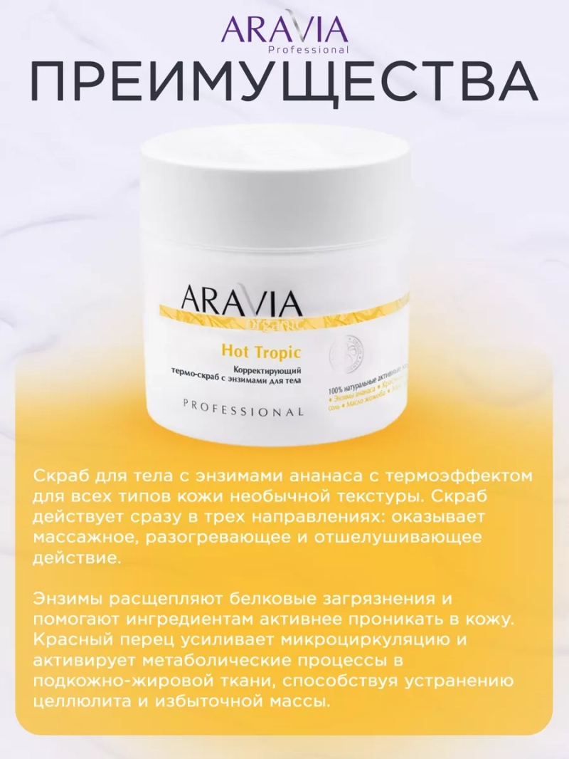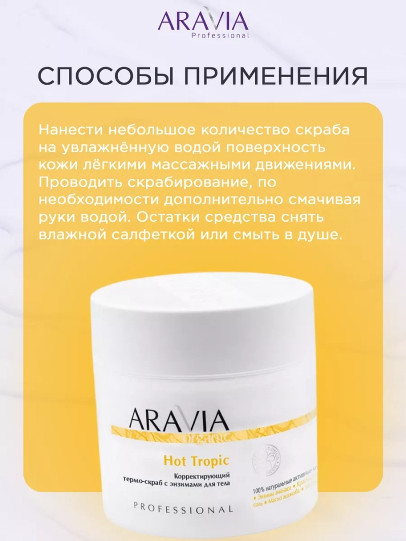КОРРЕКТИРУЮЩИЙ ТЕРМО-СКРАБ С ЭНЗИМАМИ ДЛЯ ТЕЛА HOT TROPIC, 300 МЛ. Скраб для тела с энзимами ананаса с термоэффектом для всех типов кожи необычной текстуры. Скраб действует сразу в трех направлениях: оказывает массажное, разогревающее и отшелушивающее действие. Энзимы расщепляют белковые загрязнения и помогают ингредиентам активнее проникать в кожу. Красный перец усиливает микроциркуляцию и активирует метаболические процессы в подкожно-жировой ткани, способствуя устранению целлюлита и избыточной массы. Морская соль оказывает лимфодренажный эффект и выводит лишнюю жидкость, мгновенно сокращая объемы тела. Благодаря маслам жожоба и кокоса скраб питает и смягчает кожу, оставляя после использования чувство гладкости и идеально ровной кожи. Назначение: антицеллюлитный уход. Рекомендации для использования: Профессиональный уход: этап подготовки и очищения салонной процедуры. Домашний уход: 1-2 раза в неделю. Биоактивный состав: сахар, глицерин, соль морская, масло жожоба, масло кокоса, витамин Е, экстракт ананаса, сквалан, экстракт перца жгучего, винил бутиловый эфир. Состав продукта (INCI): Sucrose, Glycerin, Sodium Chloride, Water/Aqua, Simmondsia Chinensis (Jojoba) Seed Oil, Caprylic/Capric Triglyceride, Phenoxyethanol, Cocos Nucifera (Coconut) Oil, Parfum, Xanthan Gum, Tocopheryl Acetate, Ananas Sativus (Pineapple) Fruit Extract, Tocopherol, Beta-Sitosterol, Squalene, Capsicum Annuum Fruit Extract, Vanillyl Butyl Ether, Potassium Sorbate, Sodium Benzoate, CI 19140. СПОСОБ ПРИМЕНЕНИЯ: Нанести скраб на влажную кожу тела, распределить круговыми массажными движениями до растворения соляных гранул. Остатки смыть водой. Рекомендуется использовать на очищенную кожу, перед процедурой обертывания. Меры предосторожности: не наносить на слизистую. С осторожностью использовать на зоне живота и внутренней поверхности бедер. Избегать попадания в глаза и не наносить на поврежденную кожу. Перед применением тестировать на небольшом участке кожи.