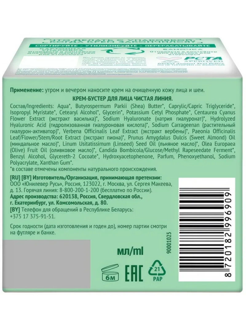 Увлажняющий гель-крем Чистая Линия содержит 97% компонентов натурального происхождения*. В составе – эссенция из пяти экстрактов и масел NATURE PLUS (экстракт вербены, экстракт пиона, масла миндаля, льна, оливы), а также экстракт василька и гиалурон-активатор. Активные натуральные компоненты питают, восстанавливают, наполняют кожу влагой и выравнивают ее микрорельеф. Результат: увлажненная, мягкая и сияющая кожа. *компоненты натурального происхождения отмечены в составе на упаковке.