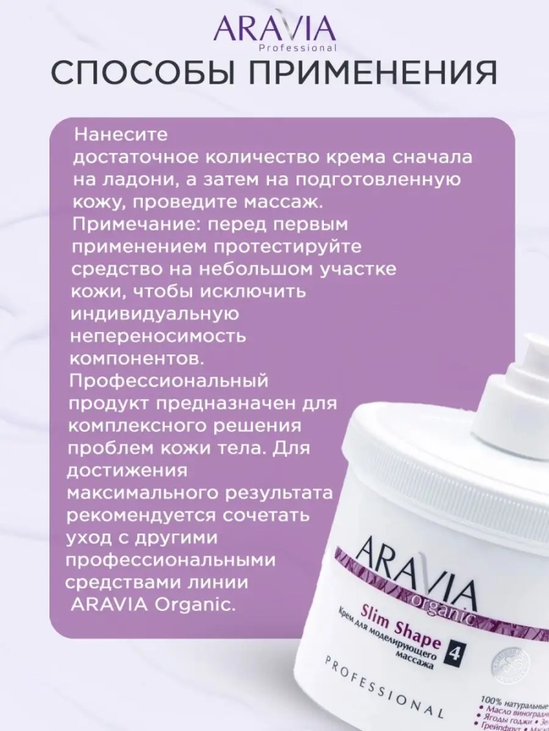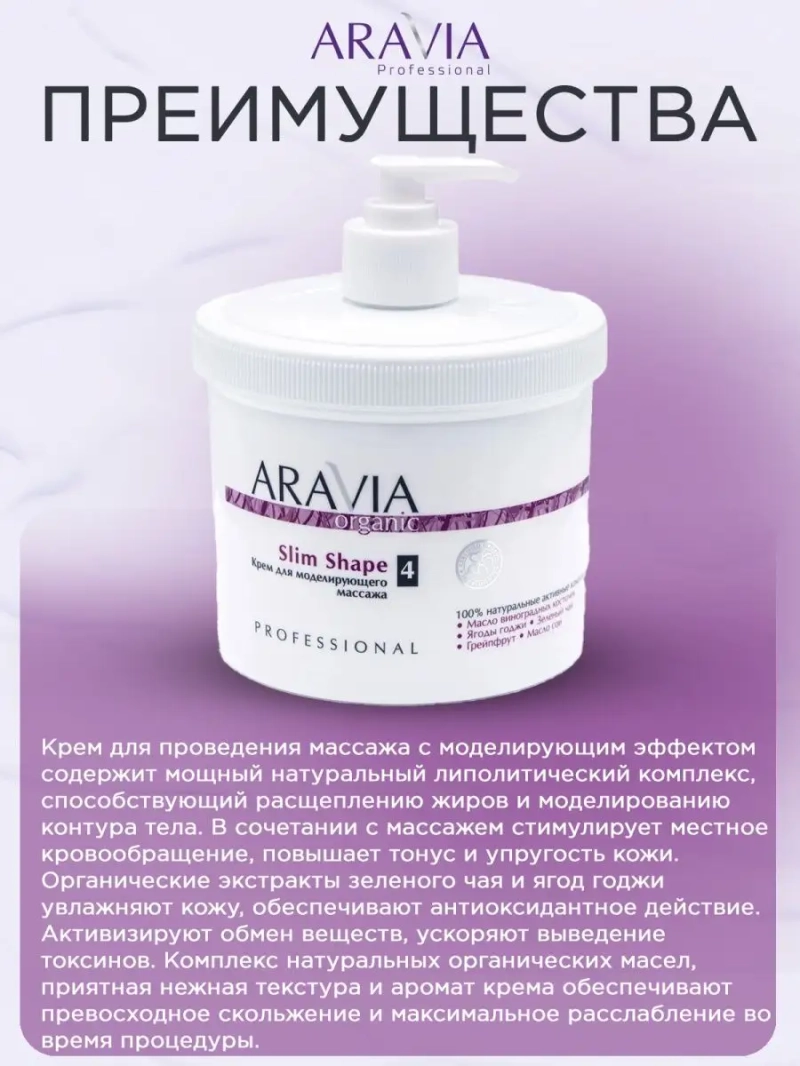 КРЕМ ДЛЯ МОДЕЛИРУЮЩЕГО МАССАЖА SLIM SHAPE, 550 МЛ. Крем для проведения массажа с моделирующим эффектом содержит мощный натуральный липолитический комплекс, способствующий расщеплению жиров и моделированию контура тела. В сочетании с массажем стимулирует местное кровообращение, повышает тонус и упругость кожи. Органические экстракты зеленого чая и ягод годжи увлажняют кожу, обеспечивают антиоксидантное действие. Активизируют обмен веществ, ускоряют выведение токсинов. Комплекс натуральных органических масел, приятная нежная текстура и аромат крема обеспечивают превосходное скольжение и максимальное расслабление во время процедуры. Назначение: все виды массажа тела. Рекомендации для использования: Профессиональный уход: все виды массажа тела в рамках салонной процедуры. ДЕЙСТВИЕ: увлажняющее, восстанавливающее, жиросжигающее, моделирующее, антиоксидантное. Биоактивный состав: масло виноградных косточек, ягоды годжи, зеленый чай, грейпфрут, масло сои. Состав продукта (INCI): Aqua, Glycine Soja (Soybean) Oil, Vitis vinifera seed oil, Mineral Oil, Stearic Acid, Glyceryl Stearate, Potassium Cetyl Phosphate, Ceteareth-20, Organic Lycium Barbarum Fruit Extract, Organic Camelia Sinensis Leaf Extract, Cyclopentasiloxane, Organic Citrus Grandis Extract, Triethanolamine, Parfum, Phenoxyethanol (and) Ethylhexylglycerin. СПОСОБ ПРИМЕНЕНИЯ: Нанесите достаточное количество крема сначала на ладони, а затем на подготовленную кожу, проведите массаж.Примечание: перед первым применением протестируйте средство на небольшом участке кожи, чтобы исключить индивидуальную непереносимость компонентов. Профессиональный продукт предназначен для комплексного решения проблем кожи тела. Для достижения максимального результата рекомендуется сочетать уход с другими профессиональными средствами линии ARAVIA Organic.