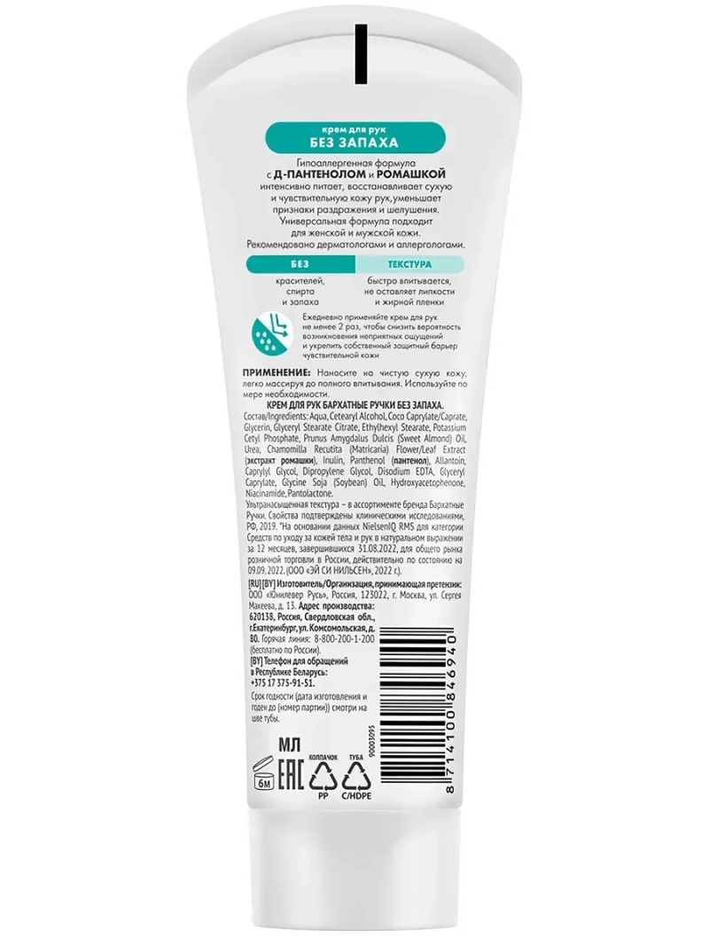 Бренд Бархатные Ручки представляет крем для рук БЕЗ ЗАПАХА. Сухая и чувствительная кожа рук требует специального и бережного ухода. Интенсивный крем с формулой Silk Oil Elixir, усиленной пантенолом и ромашкой, разработан специально для быстрого восстановления сухой и чувствительной кожи рук. Отдушки могут являться катализатором аллергии. Многие потребители не могут использовать крема с ярко-выраженным запахом из-за аллергической реакции. Крем Бархатные ручки не содержит отдушки и является гипоаллергенным, подходит для использования в сезон аллергии. Продукт рекомендован дерматологами и аллергологами. Крем обладает густой и ультра насыщенной текстурой, но при этом быстро впитывается без липкости и жирности. Текстура крема Без запаха самая насыщенная и концентрированная в основной линейке бренда Бархатные ручки . Крем для рук Бархатные ручки полностью подходит для использования для нее и для него. Универсальная формула крема полностью подходит как для женской, так и для мужской кожи рук. Формула продукта содержит 100% полезные компоненты, без красителей, парабенов, спирта, что снижает вероятность возникновения неприятных ощущений и возникновения аллергической реакции. Крем укрепляет собственный защитный барьер чувствительной кожи для предотвращения воздействия внешних агрессивных факторов. Формула продукта содержит Д-Пантенол и Ромашку. Д-пантенол восстанавливает и увлажняет сухую, чувствительную кожу рук. Ромашка успокаивает сухую и чувствительную кожу рук. Снимает признаки раздражения и шелушения кожи. [1] Свойства подтверждены клиническими исследованиями, РФ, 2019.