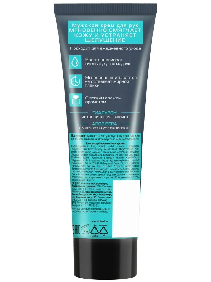 БАРХАТНЫЕ РУЧКИ Крем для рук Мужской 80мл. Новинка от бренда Бархатные ручки – мужской крем для рук – смягчает кожу и устраняет стянутость всего за одно применение. Устраняет шелушение и восстанавливает даже очень сухую кожу рук. Гиалурон интенсивно увлажняет, алоэ вера смягчает и успокаивает. Крем мгновенно впитывается, не оставляя жирной пленки. Подходит для ежедневного ухода.