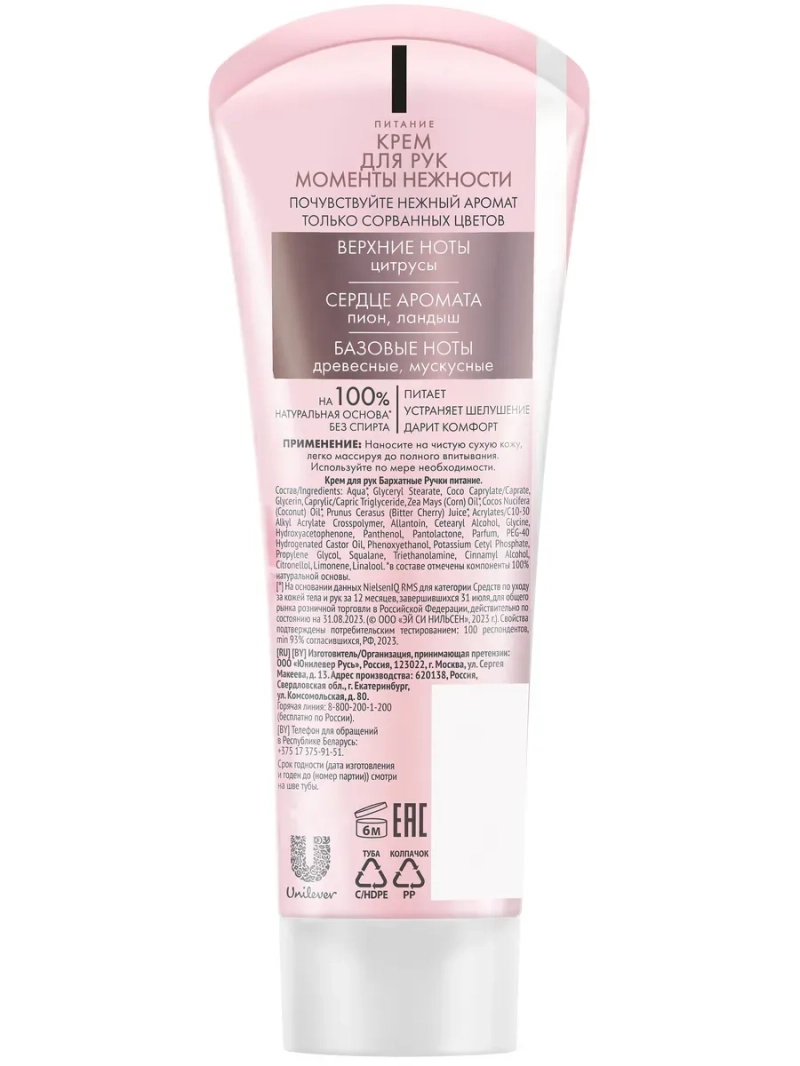 БАРХАТНЫЕ РУЧКИ Крем для рук Питание 80мл. Подарите своим ручкам качественный уход, а себе – удовольствие от аромата только что сорванных цветов вместе с новинкой от бренда Бархатные ручки – кремом Питание Моменты нежности. Формула на 100% натуральной основе с соком вишни эффективно питает, устраняет стянутость и шелушение. Не содержит спирта. Подходит для ежедневного использования. Результат: кожа рук ухоженная и мягкая.