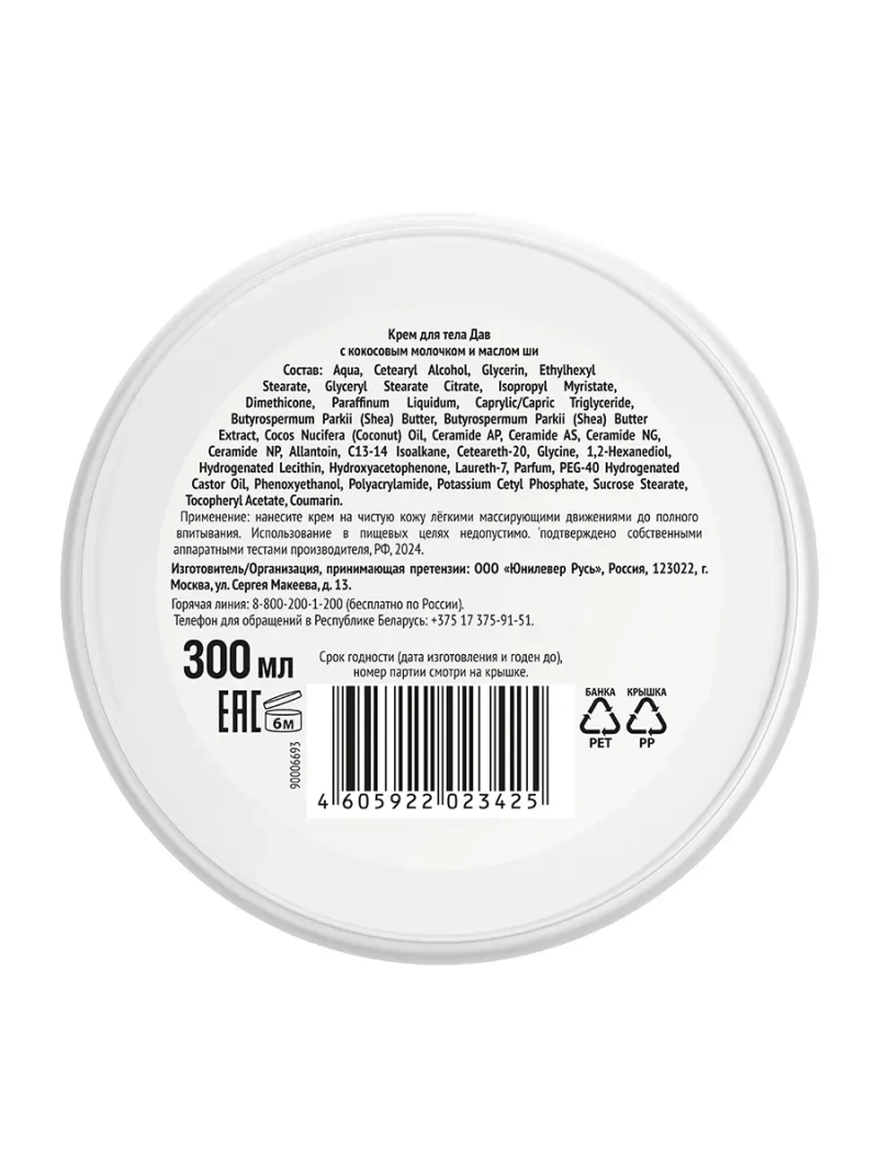 Полное наименование: DOVE крем для тела с кокосовым молочком и маслом ши 300 мл. Производитель: Unilever Россия. Новинка для ухода за телом с насыщенной текстурой и нежным кокосовым ароматом. Крем обеспечивает глубокое’ увлажнение для тела и интенсивное питание на 24 часа’’, смягчает кожу и устраняет шелушение.Также крем для тела увлажняющий с комплексом церамидов и витамином Е укрепляет кожный барьер, помогая ему удерживать больше влаги. ’в пределах эпидермиса. ’’подтверждено собственными аппаратными тестами производителя, РФ, 2024.
