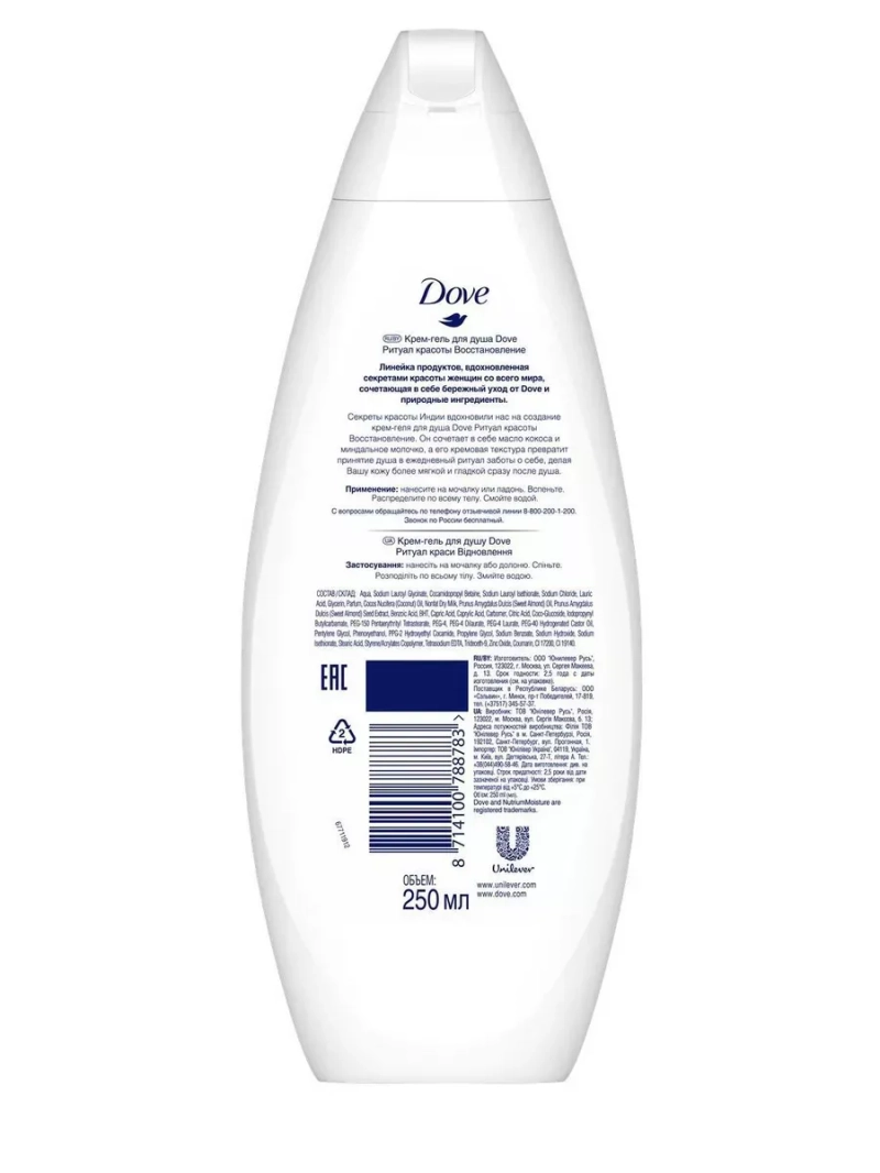 Полное наименование: Крем-гель для душа DOVE Ритуал красоты Восстановление 250мл. Производитель: Unilever Россия. Линейка продуктов, вдохновленная секретами красоты женщин со всего мира, сочетающая в себе бережный уход от Dove и природные ингредиенты. Секреты красоты Индии вдохновили нас на создание крем-геля для душа Dove Ритуал красоты Восстановление. Он сочетает в себе масло кокоса и миндальное молочко, а его кремовая текстура превратит принятие душа в ежедневный ритуал заботы о себе, делая Вашу кожу более мягкой и гладкой сразу после душа. Крем-гель для душа Dove Ритуалы красоты Восстановление с маслом кокоса и миндальным молочком интенсивно восстанавливает Вашу кожу прямо в душе благодаря питающей силе Dove