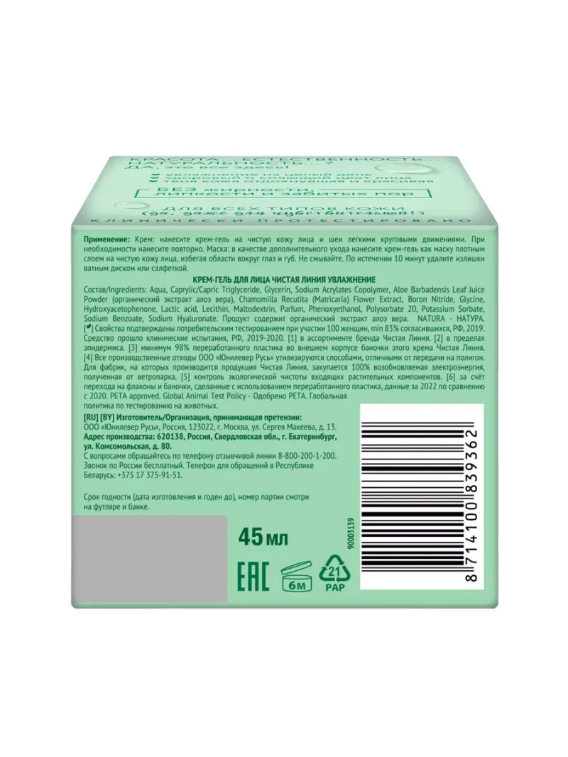 Красота...Естественность...Натуральность...? Да это всё здесь! Мы голосуем ЗА - Естественность и Натуральность твоей красоты! NATURA-это новая философия красоты бренда Чистая Линия. Природа совершенна. Зачем усложнять? Главный действующий ингредиент - 100% organic aloe...(серьезно? да,именно алоэ!): быстро и глубоко* проникает в кожу, обладает увлажняющими и влагоудерживающими свойствами. Органически выращенное алоэ. С момента сбора алоэ до вовлечения в производство экстракта-4часа. Крем-гель отлично подходит для всех типов кожи (да, даже для чувствительной!). Увлажняет, не оставляя жирного блеска. БЕЗ липких следов. Не забивает поры. А еще..МАСКА?! Для экстра-увлажнения** используй как МАСКУ: Просто нанесите крем-гель плотным слоем на чистую кожу лица, избегая области вокруг глаз и губ. Оставь на 10 минут. Излишки крем-геля удали салфеткой. Так ваша кожа получит большее увлажнение. В результате регулярного применения вы приобретаете здоровый и сияющий цвет лица, отдохнувшую и красивую кожу и увлажнение на целый день.