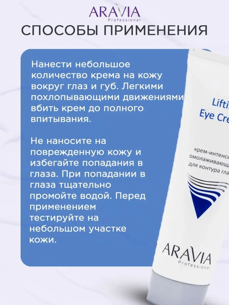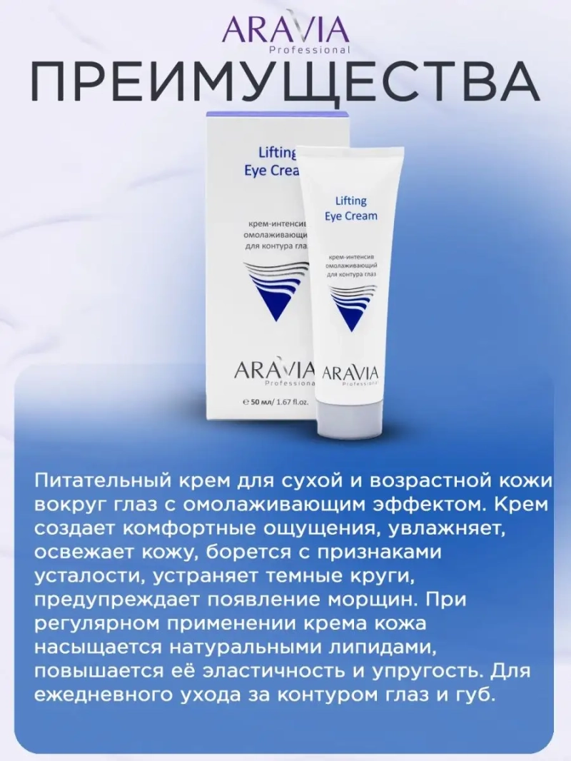 КРЕМ-ИНТЕНСИВ ОМОЛАЖИВАЮЩИЙ ДЛЯ КОНТУРА ГЛАЗ LIFTING EYE CREAM, 50 МЛ. Питательный крем для сухой и возрастной кожи вокруг глаз с омолаживающим эффектом. Крем создает комфортные ощущения, увлажняет, освежает кожу, борется с признаками усталости, устраняет темные круги, предупреждает появление морщин. При регулярном применении крема кожа насыщается натуральными липидами, повышается её эластичность и упругость. Назначение: ежедневный уход для контура глаз и губ. Рекомендации для использования: Домашний уход: ежедневный уход утром и вечером. ДЕЙСТВИЕ: комфорт и свежесть кожи, отсутствие отечности, темные круги менее заметны, мимические морщины менее заметны. Биоактивный состав: пептидный комплекс из экстракта вербены, кофеин, масло виноградной косточки, масло кокоса, ниацинамид, экстракты василька, петрушки. Пептидный комплекс из экстракта вербены улучшает состояние тонкой кожи путем ускорения клеточного обновления и стимулирования выработки коллагена и гиалуроновой кислоты. Экстракт василька повышает тургор и плотность кожи, уменьшает проницаемость капилляров, обладает лимфодренажным действием.Состав продукта (INCI): Аqua, C12-20 Acid PEG-8 Ester, Glycerin, Vitis Vinifera (Grape) Seed Oil, Cocos Nucifera (Coconut) Oil, Polymethylsilsesquioxane, Dimethicone, Isohexadecane, Cetearyl Methicone, PEG-40 Stearate, Steareth-2, Steareth-21, Phenoxyethanol (and) Ethylhexylglycerin, Verbena Officinalis Extract, Niacinamide, Centaurea Cyanus (Cornflower) Flower Extract, Petroselinum Сrispum Seed Extract, Cyclopentasiloxane, Caffeine, Triethanolamine, Acrylates/C10-30 Alkyl Acrуlate Crosspolymer, Parfum. СПОСОБ ПРИМЕННЕНИЯ: Нанести небольшое количество крема на кожу вокруг глаз и губ. Легкими похлопывающими движениями вбить крем до полного впитывания. Меры предосторожности: не наносите на поврежденную кожу и избегайте попадания в глаза. При попадании в глаза тщательно промойте водой. Перед применением тестируйте на небольшом участке кожи.