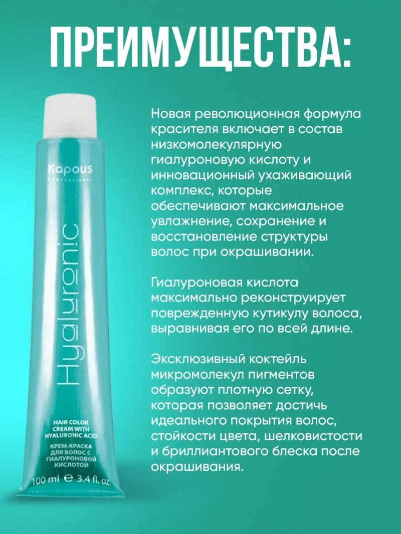 Новый уровень ухода и красоты с помощью краски капус для волос Hyaluronic Acid включает в состав низкомолекулярную гиалуроновую кислоту и инновационный ухаживающий комплекс. Studio Professional - это идеальное окрашивание или тонирование, а также восстановление волос в одной процедуре. Эта тонирующая краска идеально подходит для тех, кто хочет безопасно изменить цвет волос или освежить естественный оттенок, не прибегая к агрессивным химическим составам. Краска для волос содержит низкий процент содержания аммиака. Перманентный, аммиачный, стойкий краситель, бережно окрашивает, сохраняет здоровье, увлажнение и естественный блеск волос. Кремовая текстура капос красителя для волос обеспечивает легкое нанесение и удобство в работе. Обладает высокой стойкостью. Безопасный состав, щадящий уход без вреда для волос и кожи головы. Широкая палитра профессиональной краски для волос капус имеет много оттенков и позволяет выбрать нужный оттенок для всех типов волос: тонких, окрашенных, светлых, седых, тусклых, блонд, ломких, сухих, кудрявых, для блондинок. Обновленная формула красителя Капус Студио включает в состав гиалуроновую кислоту, краска для волос HY имеет увлажняющие и ухаживающие компоненты, которые обеспечивают краске для волос максимальную стойкость цвета и блеска, Капус крем краска обеспечивает защиту от УФ-лучей и исключительное качество волос. Эксклюзивный коктейль микромолекул пигментов образуют плотную сетку, которая позволяет достичь идеального покрытия волос, стойкости цвета, шелковистости и бриллиантового блеска после окрашивания. Простой в использовании пигмент - дающий глубокий цвет и дополнительно ухаживает за вашими локонами. Стойкий краситель для волос профессиональный применяется с оксидантом капус (1 часть крем-краски и 1,5 части крем-оксида) 1.5% или 3% 4%, 6%, 9%, 12% и 1,9%. Легкое использование тонировки капос студио для волос, дает возможность к применению не только профессионалами в салонах красоты и парикмахерских, но также и в домашних условиях.