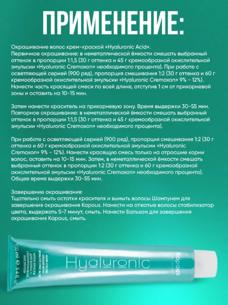 Новый уровень ухода и красоты с помощью краски капус для волос Hyaluronic Acid включает в состав низкомолекулярную гиалуроновую кислоту и инновационный ухаживающий комплекс. Studio Professional - это идеальное окрашивание или тонирование, а также восстановление волос в одной процедуре. Эта тонирующая краска идеально подходит для тех, кто хочет безопасно изменить цвет волос или освежить естественный оттенок, не прибегая к агрессивным химическим составам. Краска для волос содержит низкий процент содержания аммиака. Перманентный, аммиачный, стойкий краситель, бережно окрашивает, сохраняет здоровье, увлажнение и естественный блеск волос. Кремовая текстура капос красителя для волос обеспечивает легкое нанесение и удобство в работе. Обладает высокой стойкостью. Безопасный состав, щадящий уход без вреда для волос и кожи головы. Широкая палитра профессиональной краски для волос капус имеет много оттенков и позволяет выбрать нужный оттенок для всех типов волос: тонких, окрашенных, светлых, седых, тусклых, блонд, ломких, сухих, кудрявых, для блондинок. Обновленная формула красителя Капус Студио включает в состав гиалуроновую кислоту, краска для волос HY имеет увлажняющие и ухаживающие компоненты, которые обеспечивают краске для волос максимальную стойкость цвета и блеска, Капус крем краска обеспечивает защиту от УФ-лучей и исключительное качество волос. Эксклюзивный коктейль микромолекул пигментов образуют плотную сетку, которая позволяет достичь идеального покрытия волос, стойкости цвета, шелковистости и бриллиантового блеска после окрашивания. Простой в использовании пигмент - дающий глубокий цвет и дополнительно ухаживает за вашими локонами. Стойкий краситель для волос профессиональный применяется с оксидантом капус (1 часть крем-краски и 1,5 части крем-оксида) 1.5% или 3% 4%, 6%, 9%, 12% и 1,9%. Легкое использование тонировки капос студио для волос, дает возможность к применению не только профессионалами в салонах красоты и парикмахерских, но также и в домашних условиях.