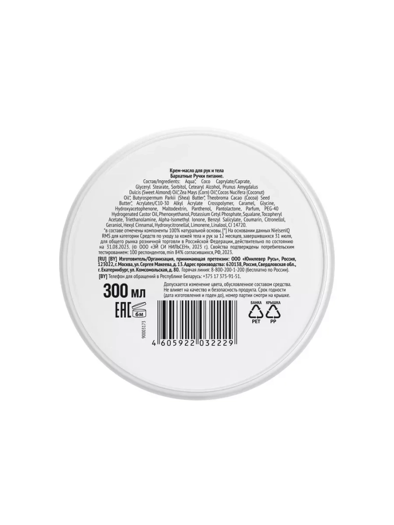 БАРХАТНЫЕ РУЧКИ Крем-масло для рук и тела Питание 300мл. Подарите себе спа-процедуру дома с новинкой от бренда Бархатные ручки, – крем-маслом для рук и тела Питание Нежная вуаль. Формула на 100% натуральной основе обогащена маслом миндаля, насыщенная текстура эффективно питает и придает коже мягкость. Аромат крем-масла открывается фруктовыми нотами, которые поддерживают ландыш и миндаль, база аромата – кремовая ваниль и мускус. *Свойства подтверждены потребительским тестированием: 100 респондентов, min 84% согласившихся, РФ, 2023.