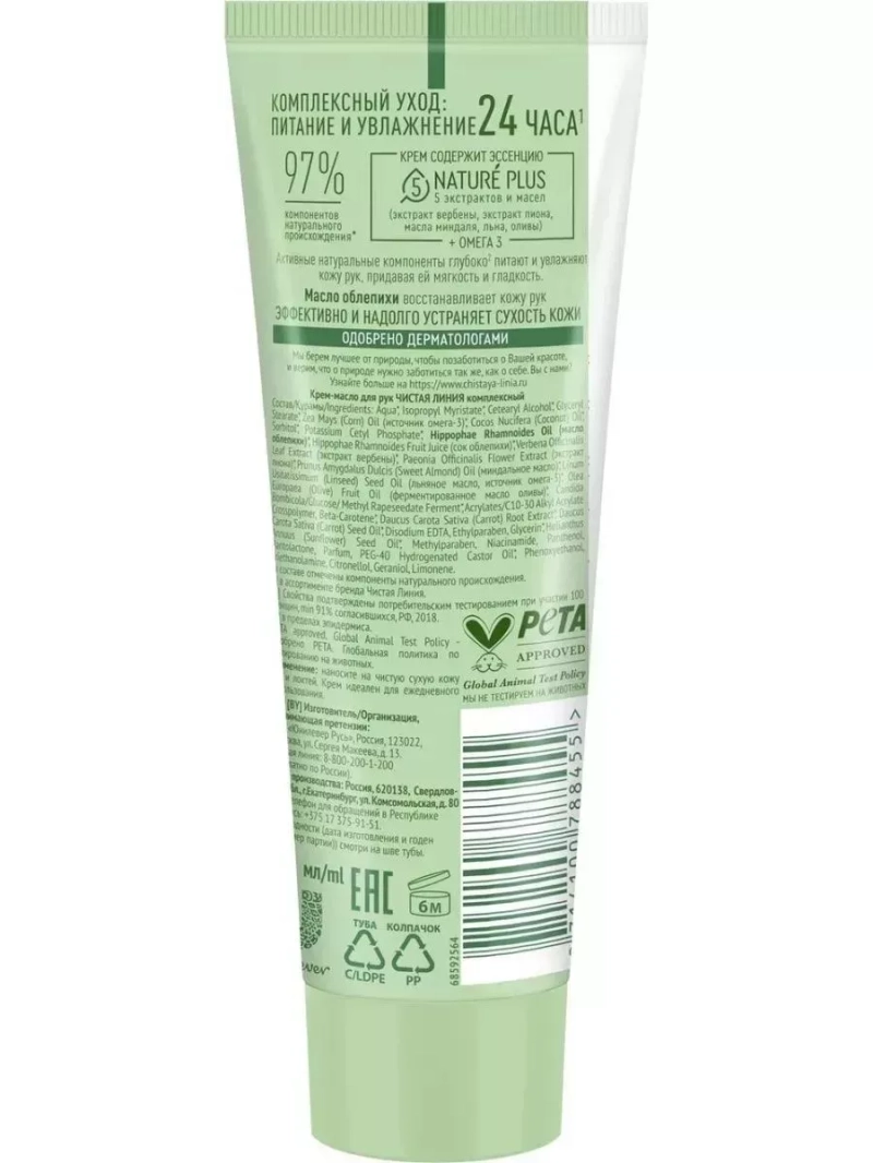 Каждая женщина мечтает выглядеть ухоженно и красиво. Для этого необходимо уделять внимание не только заботе о лице и волосах, но и уходу за руками, которые являются одним из основных критериев ухоженности. Задумывались ли Вы о том, сколько факторов окружающей среды воздействуют на кожу ваших рук? Ветер, жара, мороз и многое другое ежедневно наносит вред Вашей коже, делая ее грубой и сухой. Именно поэтому домашний уход за руками очень важен. Подарите своей коже особый уход! Крем-масло для рук и локтей обеспечивает комплексный уход. 97% компонентов натурального происхождения подарят Вашей коже питание и увлажнение 24 часа. Масло облепихи способствует насыщению кожи витаминами и ее восстановлению. Комплекс фитомасел глубоко питает кожу, делая ее мягкой и гладкой. Ультранасыщенная текстура крема подходит даже для грубой кожи. В результате крем-масло обеспечивает бережный уход, эффективно и надолго устраняя сухость кожи рук.