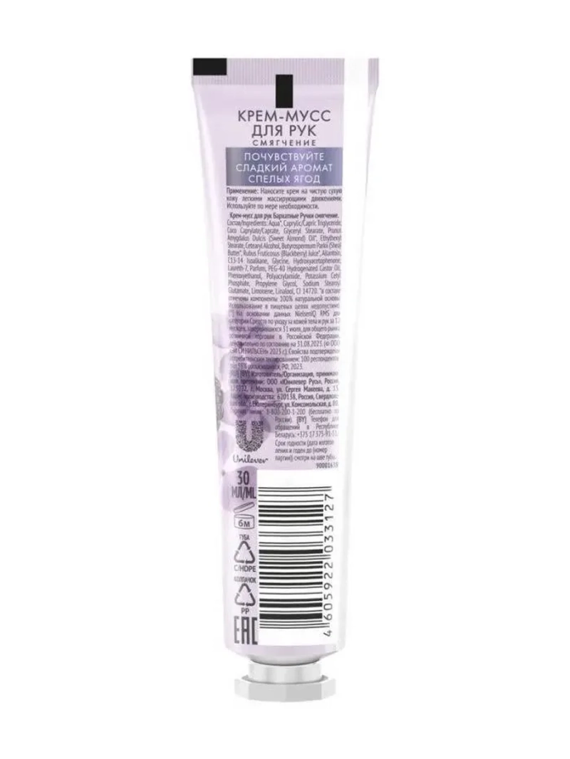 БАРХАТНЫЕ РУЧКИ Крем-мусс для рук Смягчение 30мл. Для мягкой и ухоженной кожи рук попробуйте крем Смягчение из новой парфюмированной серии бренда Бархатные ручки. Манящий аромат спелых ягод – еще один повод позаботиться о ручках. Формула на 100% натуральной основе, обогащенной маслами миндаля и ши, соком ежевики, эффективно смягчает, восстанавливает и питает. Нежная текстура мусса розового цвета быстро впитывается, не оставляя липкости и жирности. Результат: кожа рук вновь мягкая и ухоженная.