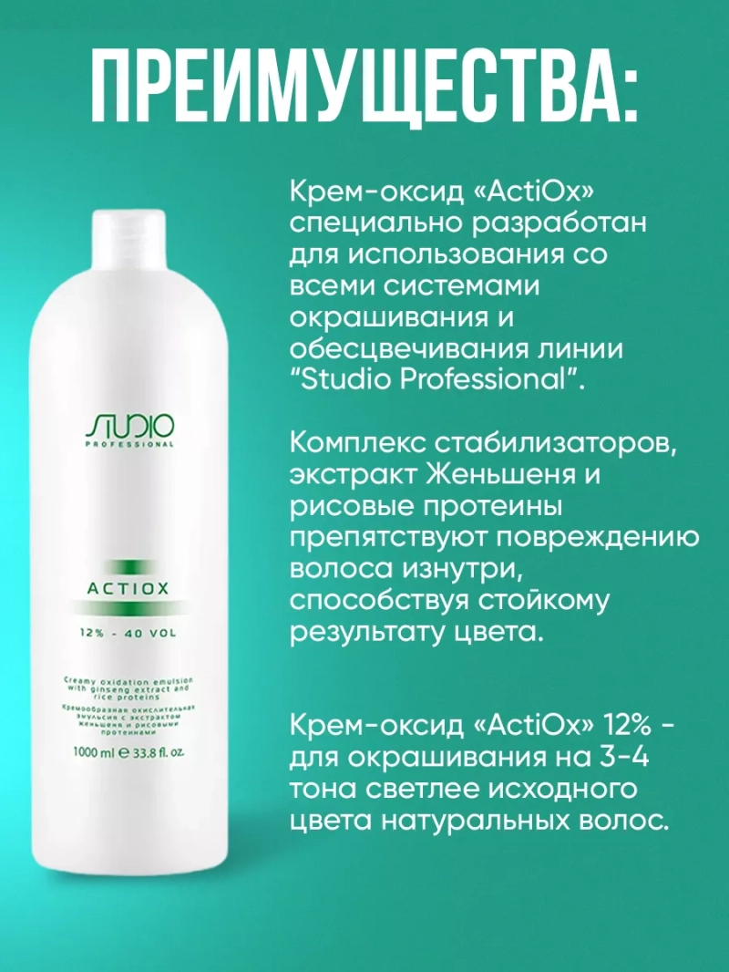 CremOXON 12% с женьшенем и рисовыми протеинами Крем-оксид "ActiOx" специально разработан для использования со всеми системами окрашивания и обесцвечивания линии “Studio Professional”. Комплекс стабилизаторов, экстракт Женьшеня и рисовые протеины препятствуют повреждению волоса изнутри, способствуя стойкому результату цвета.Крем-оксид "ActiOx" 12% - для окрашивания на 3-4 тона светлее исходного цвета натуральных волос.ТОЛЬКО ДЛЯ ПРОФЕССИОНАЛЬНОГО ПРИМЕНЕНИЯ. Состав: aqua (water), hydrogen peroxide, cetearyl alcohol, ceteareth-20, mineral oil, lauryl alcohol, myristyl alcohol, hexyldecyl laurate, hexyldecanol, fragrance, etidronic acid, tetrasodium edta, oxyquinoline sulfate, simethicone, laureth-3, ceteareth-20, glycerin, sodium pca, urea, trehalose, leuconostoc/radish root ferment filtrate, polyquaternium-51, sodium hyaluronate. Способ применения: следовать инструкциям по применению препаратов "Kapous" для окраски, обесцвечивания и цветного мелирования.