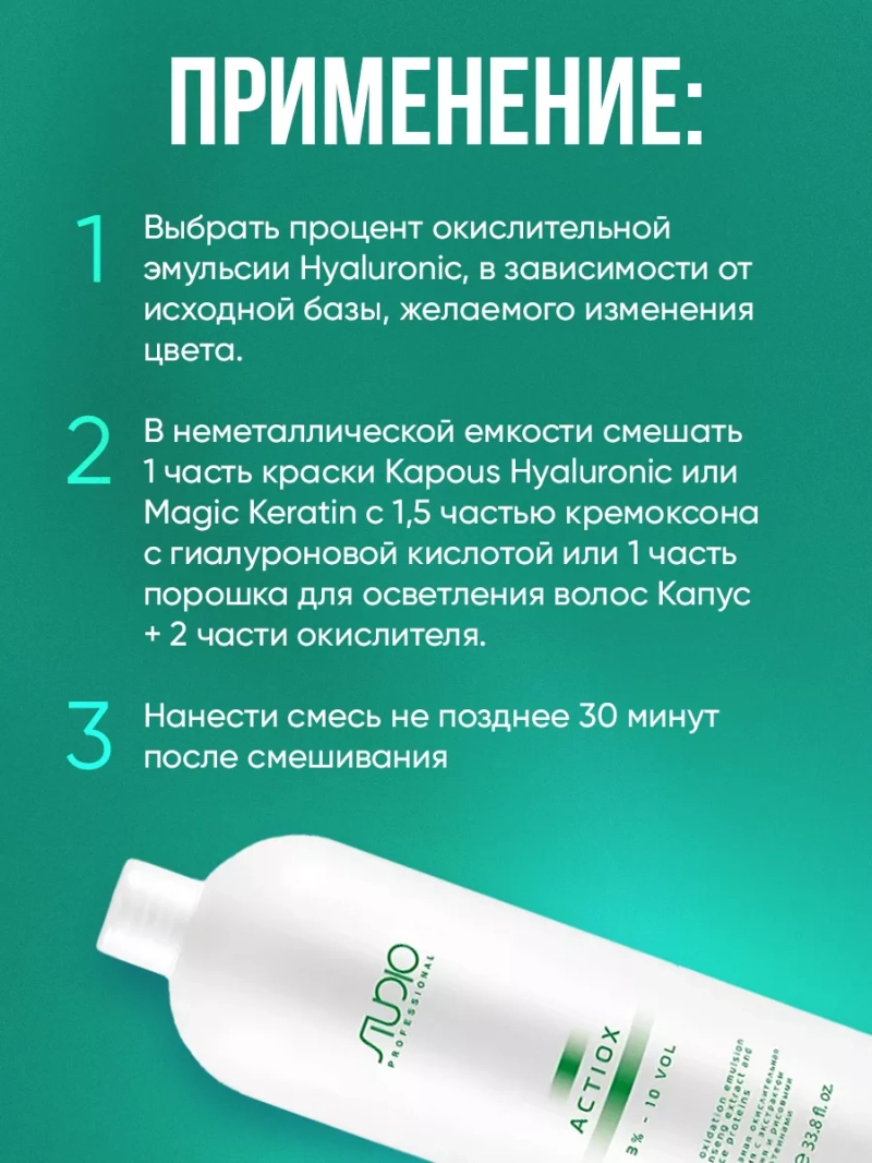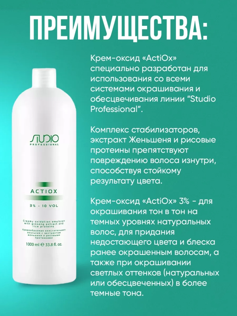 CremOXON 3% с женьшенем и рисовыми протеинами Крем-оксид "ActiOx" специально разработан для использования со всеми системами окрашивания и обесцвечивания линии “Studio Professional”. Комплекс стабилизаторов, экстракт Женьшеня и рисовые протеины препятствуют повреждению волоса изнутри, способствуя стойкому результату цвета.Крем-оксид "ActiOx" 3% - для окрашивания тон в тон на темных уровнях натуральных волос, для придания недостающего цвета и блеска ранее окрашенным волосам, а также при окрашивании светлых оттенков (натуральных или обесцвеченных) в более темные тона.ТОЛЬКО ДЛЯ ПРОФЕССИОНАЛЬНОГО ПРИМЕНЕНИЯ. Состав: aqua (water), hydrogen peroxide, cetearyl alcohol, ceteareth-20, mineral oil, lauryl alcohol, myristyl alcohol, hexyldecyl laurate, hexyldecanol, fragrance, etidronic acid, tetrasodium edta, oxyquinoline sulfate, simethicone, laureth-3, ceteareth-20, glycerin, sodium pca, urea, trehalose, leuconostoc/radish root ferment filtrate, polyquaternium-51, sodium hyaluronate. Способ применения: следовать инструкциям по применению препаратов "Kapous" для окраски, обесцвечивания и цветного мелирования.