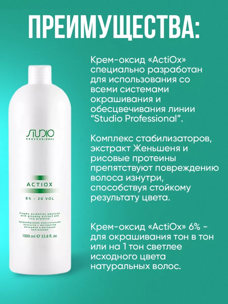 CremOXON 6% с женьшенем и рисовыми протеинами Крем-оксид "ActiOx" специально разработан для использования со всеми системами окрашивания и обесцвечивания линии “Studio Professional”. Комплекс стабилизаторов, экстракт Женьшеня и рисовые протеины препятствуют повреждению волоса изнутри, способствуя стойкому результату цвета.Крем-оксид "ActiOx" 6% - для окрашивания тон в тон или на 1 тон светлее исходного цвета натуральных волос.ТОЛЬКО ДЛЯ ПРОФЕССИОНАЛЬНОГО ПРИМЕНЕНИЯ. Состав: aqua (water), hydrogen peroxide, cetearyl alcohol, ceteareth-20, mineral oil, lauryl alcohol, myristyl alcohol, hexyldecyl laurate, hexyldecanol, fragrance, etidronic acid, tetrasodium edta, oxyquinoline sulfate, simethicone, laureth-3, ceteareth-20, glycerin, sodium pca, urea, trehalose, leuconostoc/radish root ferment filtrate, polyquaternium-51, sodium hyaluronate. Способ применения: следовать инструкциям по применению препаратов "Kapous" для окраски, обесцвечивания и цветного мелирования.