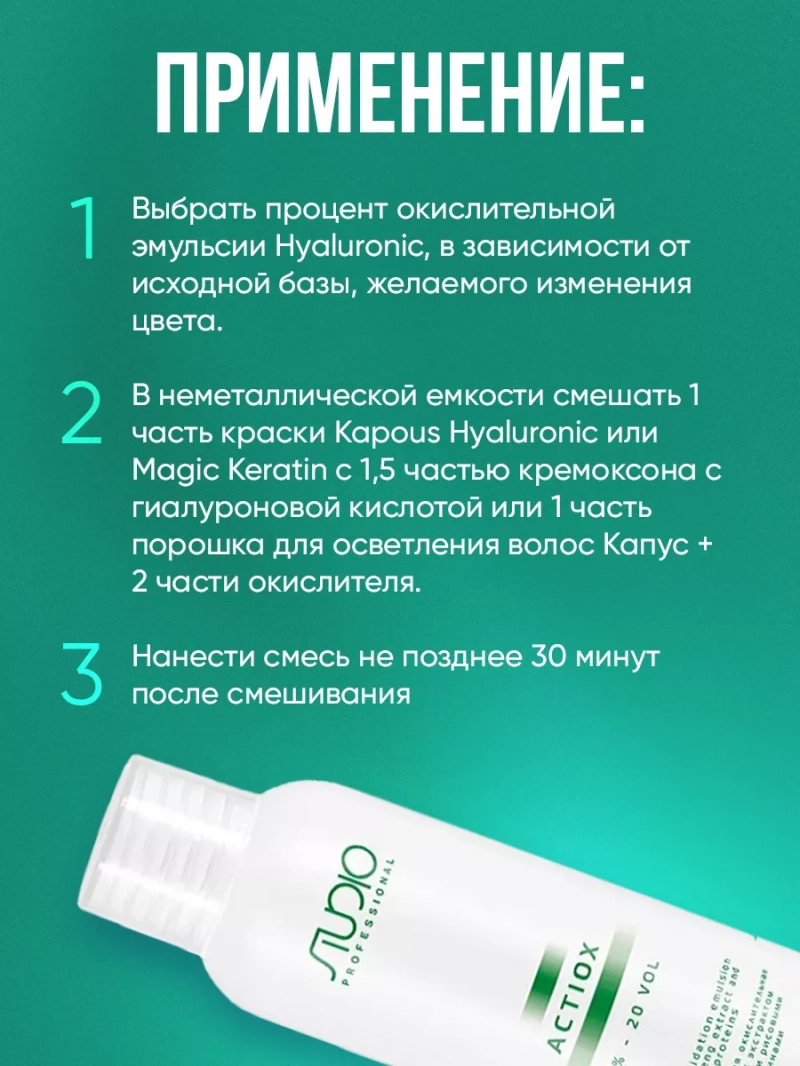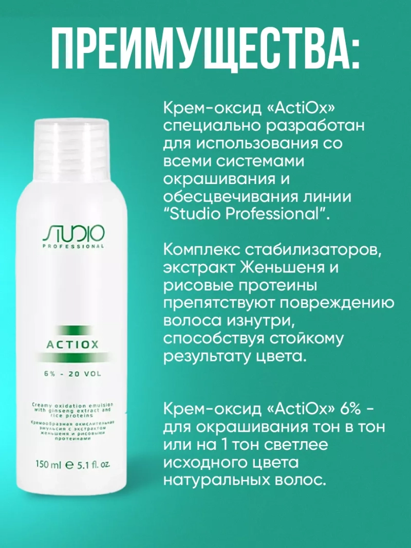 CremOXON 6% с женьшенем и рисовыми протеинами Крем-оксид "ActiOx" специально разработан для использования со всеми системами окрашивания и обесцвечивания линии “Studio Professional”. Комплекс стабилизаторов, экстракт Женьшеня и рисовые протеины препятствуют повреждению волоса изнутри, способствуя стойкому результату цвета.Крем-оксид "ActiOx" 6% - для окрашивания тон в тон или на 1 тон светлее исходного цвета натуральных волос.ТОЛЬКО ДЛЯ ПРОФЕССИОНАЛЬНОГО ПРИМЕНЕНИЯ. Состав: aqua (water), hydrogen peroxide, cetearyl alcohol, ceteareth-20, mineral oil, lauryl alcohol, myristyl alcohol, hexyldecyl laurate, hexyldecanol, fragrance, etidronic acid, tetrasodium edta, oxyquinoline sulfate, simethicone, laureth-3, ceteareth-20, glycerin, sodium pca, urea, trehalose, leuconostoc/radish root ferment filtrate, polyquaternium-51, sodium hyaluronate. Способ применения: следовать инструкциям по применению препаратов "Kapous" для окраски, обесцвечивания и цветного мелирования.