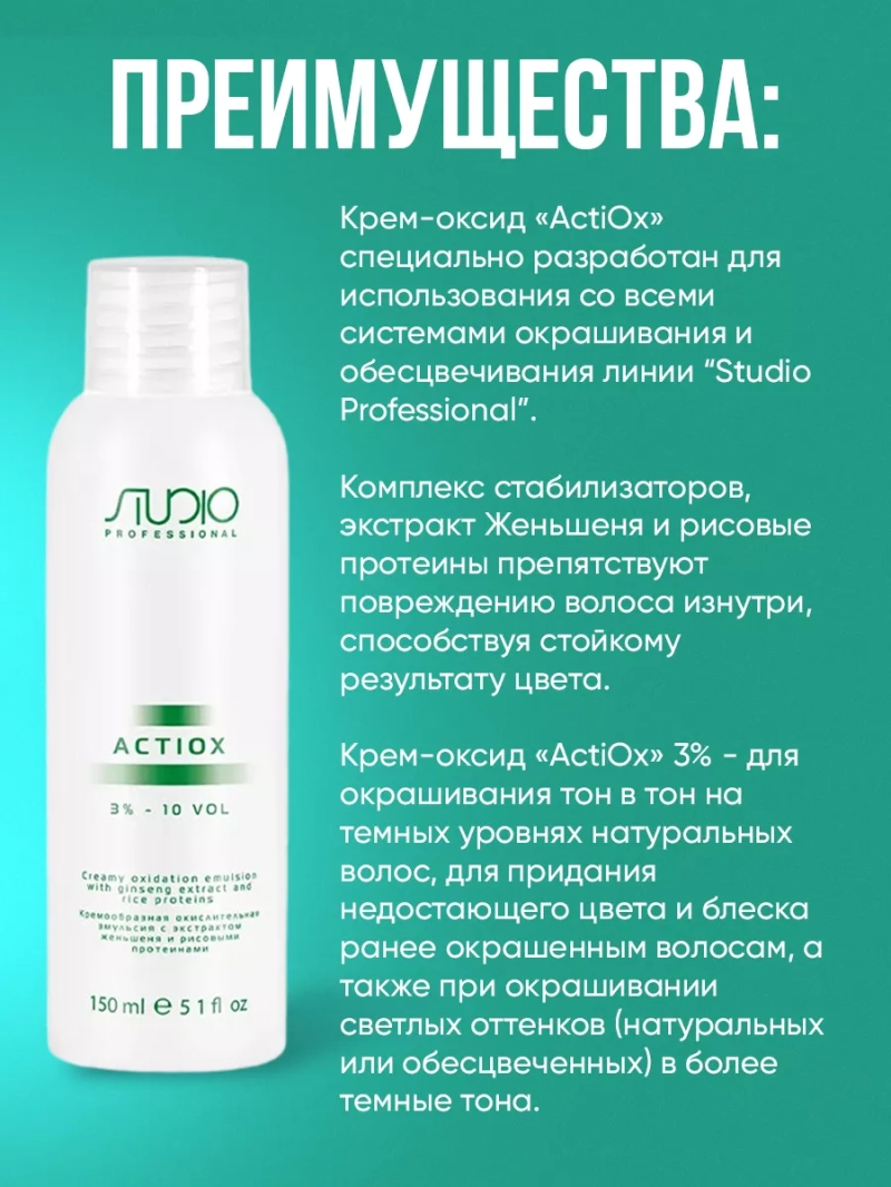 CremOXON 3% с женьшенем и рисовыми протеинами Крем-оксид "ActiOx" специально разработан для использования со всеми системами окрашивания и обесцвечивания линии “Studio Professional”. Комплекс стабилизаторов, экстракт Женьшеня и рисовые протеины препятствуют повреждению волоса изнутри, способствуя стойкому результату цвета.Крем-оксид "ActiOx" 3% - для окрашивания тон в тон на темных уровнях натуральных волос, для придания недостающего цвета и блеска ранее окрашенным волосам, а также при окрашивании светлых оттенков (натуральных или обесцвеченных) в более темные тона.ТОЛЬКО ДЛЯ ПРОФЕССИОНАЛЬНОГО ПРИМЕНЕНИЯ. Состав: aqua (water), hydrogen peroxide, cetearyl alcohol, ceteareth-20, mineral oil, lauryl alcohol, myristyl alcohol, hexyldecyl laurate, hexyldecanol, fragrance, etidronic acid, tetrasodium edta, oxyquinoline sulfate, simethicone, laureth-3, ceteareth-20, glycerin, sodium pca, urea, trehalose, leuconostoc/radish root ferment filtrate, polyquaternium-51, sodium hyaluronate. Способ применения: следовать инструкциям по применению препаратов "Kapous" для окраски, обесцвечивания и цветного мелирования.