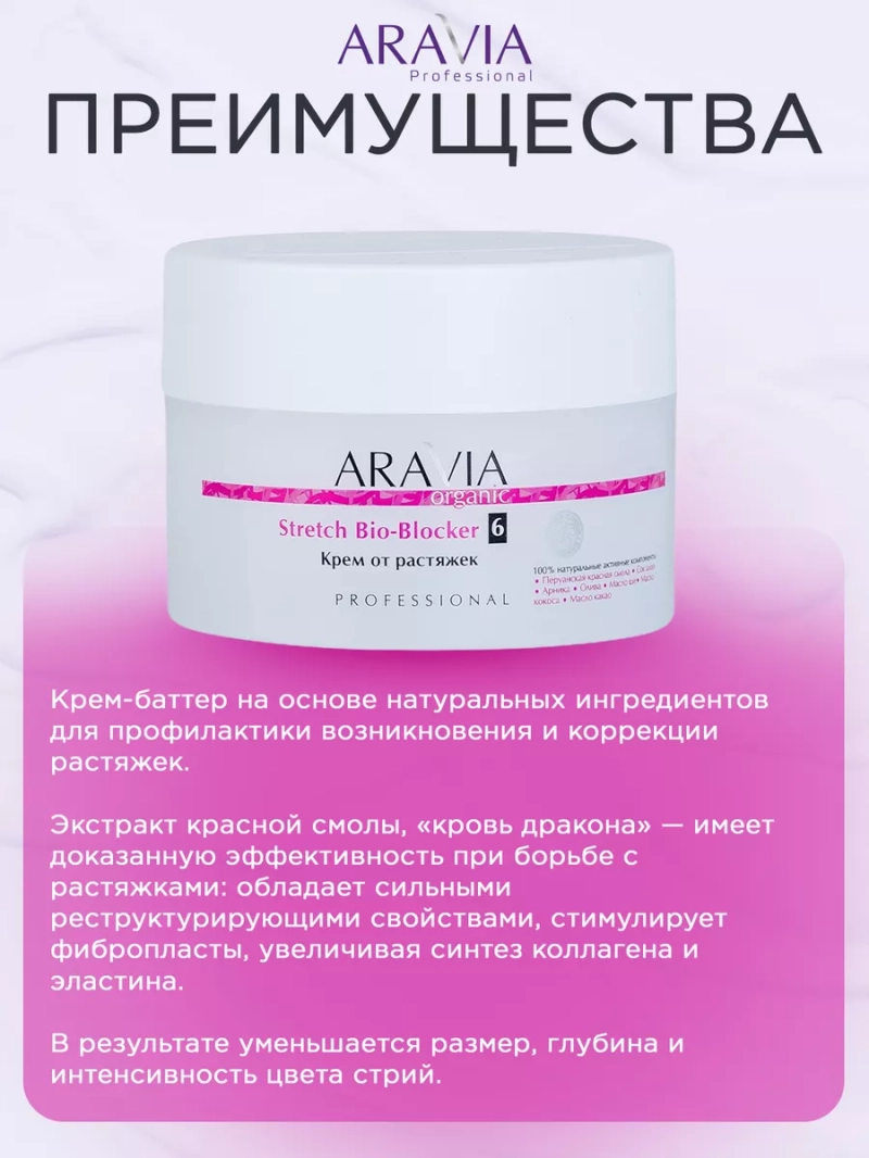 КРЕМ ОТ РАСТЯЖЕК STRETCH BIO-BLOCKER, 150 МЛ. Крем-баттер на основе натуральных ингредиентов для профилактики возникновения и коррекции растяжек. Экстракт красной смолы, — имеет доказанную эффективность при борьбе с растяжками: обладает сильными реструктурирующими свойствами, стимулирует фибропласты, увеличивая синтез коллагена и эластина. В результате уменьшается размер, глубина и интенсивность цвета стрий. Крем повышает тургор и плотность кожи и устраняет стягивание и сухость, предупреждая разрывы тканей. Подходит для применения как во время подготовки и течения беременности для предотвращения образования растяжек, так и после для акселерации восстановления кожи и устранения дряблости. Назначение: уход за кожей склонной к появлению растяжек, уход за сухой и очень сухой атоничной кожей, период беременности. Рекомендации для использования: Профессиональный уход: завершающий уход в процедуре. Домашний уход: 2-3 раза в неделю для профилактики; ежедневно во время беременности. ДЕЙСТВИЕ: восстанавливающее, суперувлажняющее, регенерирующее, питательное. Биоактивный состав: масло ши, масло кокоса, масло какао, глицерин, экстракт арники, гель алоэ, экстракт кротона, витамин Е, экстракт оливы. Состав продукта (INCI): Aqua, Butyrospermum Parkii (Shea Butter), Cocos Nucifera Seed Butter, Theobroma Cacao Seed Butter, Glycerin, Cetearyl Olivate, Arnica Montana Flower Extract, Sorbitan Olivate, Caprylic/Capric Triglyceride, Cetearyl Alcohol, Aloe Barbadensis Leaf Juice, Cetyl Palmitate, Ethyl Olivate, Phenoxyethanol, Aluminum Sucrose Octasulfate, Croton Lechleri Resin Extract, Tocopheryl Acetate, Hydroxyacetophenone, Parfum. СПОСОБ ПРИМЕНЕНИЯ: Регулярно 1-2 раза в день наносить на проблемные участки кожи, массажными движениями до полного впитывания. Меры предосторожности: не наносите на поврежденную кожу и избегайте попадания в глаза. При попадании в глаза тщательно промойте водой. Перед применением тестируйте на небольшом участке кожи.