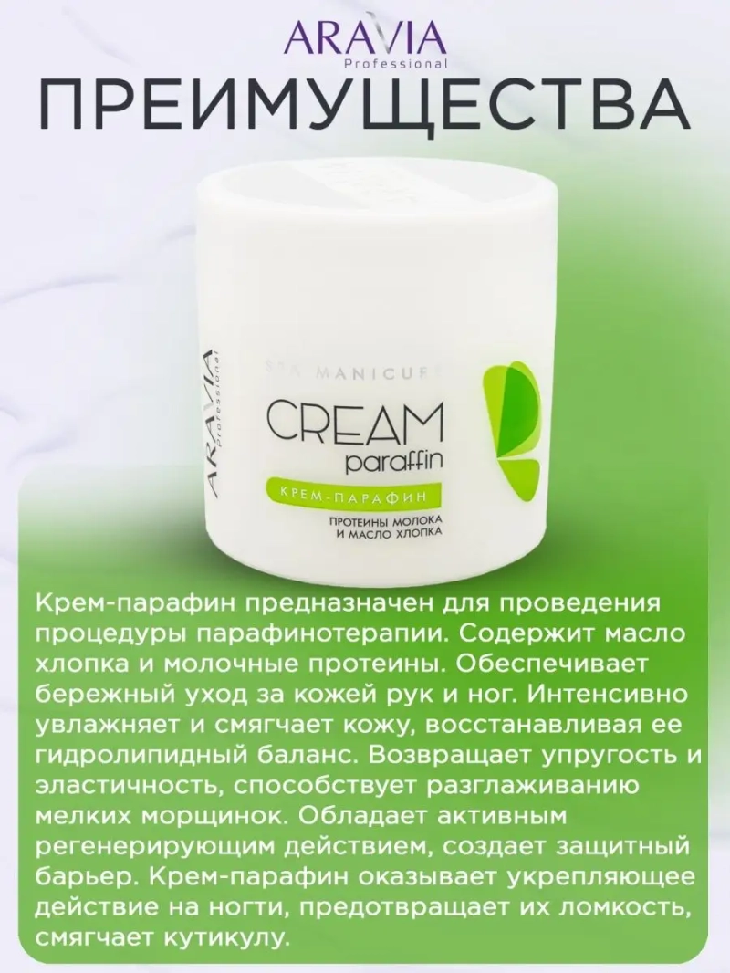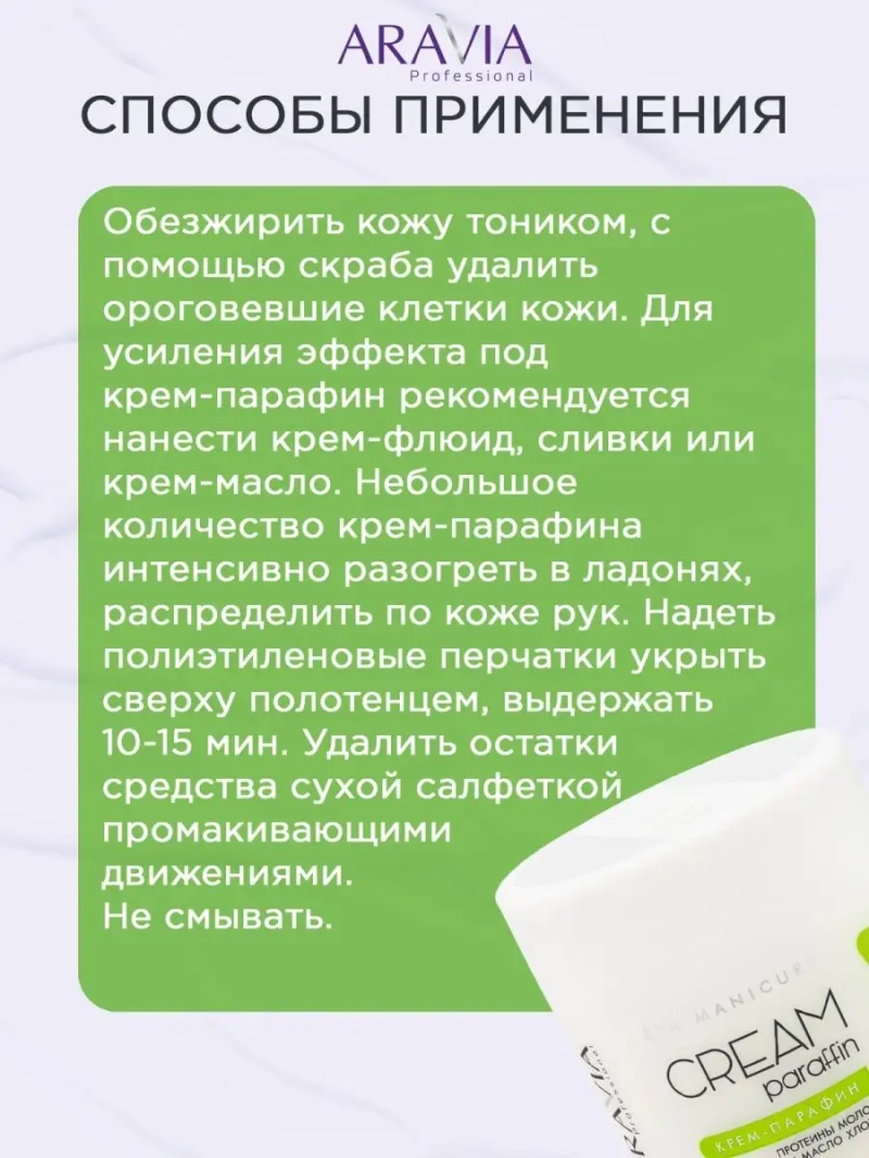 Крем-парафин "Натуральный" с молочными протеинами и маслом хлопка. Крем-парафин предназначен для проведения процедуры парафинотерапии. Обеспечивает бережный уход за кожей рук и ног. Интенсивно увлажняет и смягчает кожу, восстанавливая ее гидролипидный баланс. Возвращает упругость и эластичность, способствуя разглаживанию мелких морщинок. Хлопковое масло обладает активным регенерирующим действием. Молочные протеины обновляют защитную систему кожи. Крем-парафин оказывает укрепляющее действие на ногти, предотвращает их ломкость, смягчает кутикулу. АКТИВНЫЕ КОМПОНЕНТЫ: Хлопковое масло и молочные протеины. СПОСОБЫ ПРИМЕНЕНИЯ: Небольшое количество крем-парафина интенсивно разогрейте в ладонях, распределите по коже рук тонким слоем, наденьте полиэтиленовые перчатки и сверху укройте теплоудерживающим материалом. Через 10-15 минут снимите перчатки и промокните остатки парафина сухой бумажной салфеткой. Масла и экстракты: масло хлопка, масло ши (карите). Примечание: Не смывать! Cостав: paraffinum liquidum, paraffin, lanolin, butyrospermum parkii (shea butter), milk protein, gossypium hirsutum seed oil, tocopheryl acetate