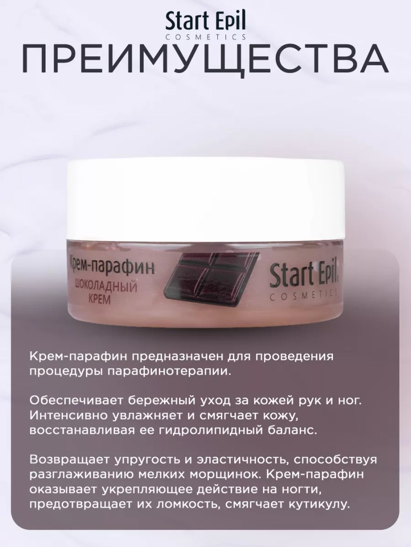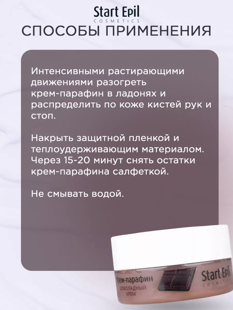 КРЕМ-ПАРАФИН «ШОКОЛАДНЫЙ КРЕМ», 150 МЛ. Крем-парафин предназначен для интенсивного ухода за кожей рук и ног. Масло ши оказывает питательное и увлажняющее действие на кожу. В процессе процедуры крем-парафин согревает и расслабляет мышцы, омолаживает и питает кожу рук, возвращает упругость и эластичность, способствует разглаживанию морщин, укрепляет ногтевую пластину. Назначение: увлажнение и питание кожи рук и ног. Рекомендации для использования: для профессионального использования. Биоактивный состав: масло ши, масло какао, экстракт ванили. Состав продукта (INCI): Paraffinum Liquidum, Paraffin, Lanolin, Butyrospermum Parkii (Shea Butter), Theobroma Cacao (Cocoa) Seed Butter, Vanilla Plantifolia (vanille) Extract, Tocopheryl Acetate, CI26100, CI47000, CI60725. СПОСОБ ПРИМЕНЕНИЯ: Интенсивными растирающими движениями разогреть крем-парафин в ладонях и распределить по коже кистей рук и стоп. Накрыть защитной пленкой и теплоудерживающим материалом. Через 15-20 минут снять остатки крем-парафина салфеткой. Не смывать водой. Меры предосторожности: не наносите на поврежденную кожу и избегайте попадания в глаза. При попадании в глаза тщательно промойте водой.