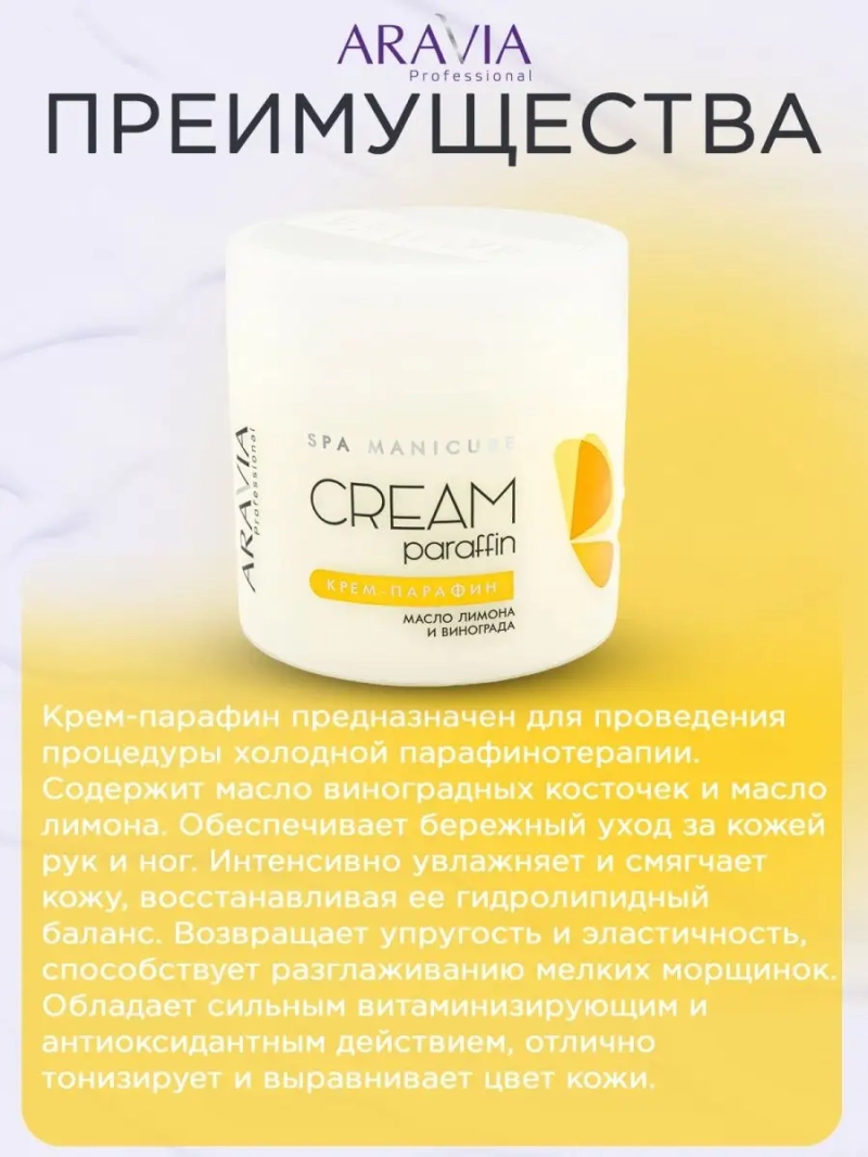 Крем -парафин "Тропический коктейль" с маслом лимона и маслом виноградных косточек. КРЕМ-ПАРАФИН ПРЕДНАЗНАЧЕН ДЛЯ ПРОВЕДЕНИЯ ПРОЦЕДУРЫ ПАРАФИНОТЕРАПИИ. ОБЕСПЕЧИВАЕТ БЕРЕЖНЫЙ УХОД ЗА КОЖЕЙ РУК И НОГ. ИНТЕНСИВНО УВЛАЖНЯЕТ И СМЯГЧАЕТ КОЖУ, ВОССТАНАВЛИВАЯ ЕЕ ГИДРОЛИПИДНЫЙ БАЛАНС. ВОЗВРАЩАЕТ УПРУГОСТЬ И ЭЛАСТИЧНОСТЬ, СПОСОБСТВУЯ РАЗГЛАЖИВАНИЮ МЕЛКИХ МОРЩИНОК. МАСЛО ВИНОГРАДНЫХ КОСТОЧЕК ОБЛАДАЕТ СИЛЬНЫМ ВИТАМИНИЗИРУЮЩИМ И АНТИОКСИДАНТНЫМ ДЕЙСТВИЕМ. МАСЛО ЛИМОНА ОТЛИЧНО ТОНИЗИРУЕТ И ВЫРАВНИВАЕТ ЦВЕТ КОЖИ. КРЕМ-ПАРАФИН ОКАЗЫВАЕТ УКРЕПЛЯЮЩЕЕ ДЕЙСТВИЕ НА НОГТИ, ПРЕДОТВРАЩАЕТ ИХ ЛОМКОСТЬ, СМЯГЧАЕТ КУТИКУЛУ. АКТИВНЫЕ КОМПОНЕНТЫ: МАСЛО ВИНОГРАДА, МАСЛО ЛИМОНА. СПОСОБ ПРИМЕНЕНИЯ: НЕБОЛЬШОЕ КОЛИЧЕСТВО КРЕМ-ПАРАФИНА ИНТЕНСИВНО РАЗОГРЕЙТЕ В ЛАДОНЯХ, РАСПРЕДЕЛИТЕ ПО КОЖЕ РУК ТОНКИМ СЛОЕМ, НАДЕНЬТЕ ПОЛИЭТИЛЕНОВЫЕ ПЕРЧАТКИ И СВЕРХУ УКРОЙТЕ ТЕПЛОУДЕРЖИВАЮЩИМ МАТЕРИАЛОМ. ЧЕРЕЗ 10-15 МИНУТ СНИМИТЕ ПЕРЧАТКИ И ПРОМОКНИТЕ ОСТАТКИ ПАРАФИНА СУХОЙ БУМАЖНОЙ САЛФЕТКОЙ. ПРИМЕЧАНИЕ: НЕ СМЫВАТЬ! НЕ НАНОСИТЬ НА ПОВРЕЖДЕННУЮ КОЖУ. ВО ИЗБЕЖАНИЕ ИНДИВИДУАЛЬНОЙ НЕПЕРЕНОСИМОСТИ КОМПОНЕНТОВ ПЕРЕД ПРИМЕНЕНИЕМ ПРОТЕСТИРУЙТЕ НА НЕБОЛЬШОМ УЧАСТКЕ КОЖИ. Cостав: paraffinum liquidum, paraffin, lanolin, butyrospermum parkii (shea Butter), citrus limonum peel oil, grape seed oil, tocopheryl acetate, prunus persica (peach) kemel oil, parfume, yellow №11
