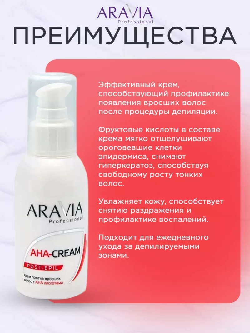 КРЕМ ПРОТИВ ВРОСШИХ ВОЛОС С АНА КИСЛОТАМИ, 100 МЛ. Эффективный крем, способствующий профилактике появления вросших волос после процедуры депиляции. Фруктовые кислоты в составе крема мягко отшелушивают ороговевшие клетки эпидермиса, снимают гиперкератоз, способствуя свободному росту тонких волос. Увлажняет кожу, способствует снятию раздражения и профилактике воспалений. Подходит для ежедневного ухода за депилируемыми зонами. Назначение: межкурсовой уход между процедурами депиляции. Биоактивный состав: масло бобов сои, экстракт папайи, экстракт корня солодки, салициловая кислота, винная кислота, лимонная кислота. Состав продукта (INCI): Aqua, Glycine Soja (Soy Bean) Oil, Stearic Acid, Potassium Cetyl Phosphate, Carica Papaya Fruit Extract, Urea, Glycerin, Glyceryl Stearate, Glycyrrhiza Glabra (Licorice) Root Extract, Dimethicone, Citric Acid, Bisabolol, BHT, Parfum, Phenoxyethanol (and) Methylparaben (and) Ethylparaben (and) Propylparaben. СПОСОБ ПРИМЕНЕНИЯ: Наносить ежедневно небольшое количество крема на чистую кожу депилированных зон круговыми движениями до полного впитывания. Начинать применение не раньше, чем через 24 часа после процедуры депиляции. Для пролонгированного эффекта применять ежедневно.Меры предосторожности: не наносите на поврежденную кожу и избегайте попадания в глаза. При попадании в глаза тщательно промойте водой. Перед применением тестируйте на небольшом участке кожи.