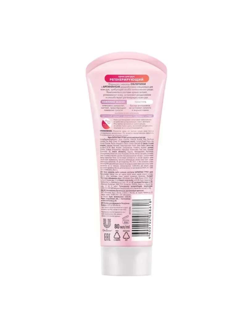 Бренд Бархатные Ручки представляет крем для рук Регенерирующий. Крем разработан специально для кожи рук, требующей особо интенсивного ухода. Компоненты в составе крема активируют восстановление клеток, обеспечивая профилактику появления мелких трещинок`. Формула Silk Oil Elixir усиливает действие крема. Микромасла восстанавливают клетки кожи и в комплексе с протеинами шелка делают ее мягкой и нежной. Кожа рук ежедневно испытывает колоссальное воздействие разрушающих стресс-факторов. Регулярное применение крема для рук, не менее 2-х раз в день, восполняет ресурсы кожи, защищая ее от микроповреждений. Формула Silk Oil Elexir представляет собой комплекс, состоящий из микромасел и протеинов шелка. Благодаря своему размеру (до 10 мкм), эти частицы масел способны проникать внутрь эпидермиса, не нарушая липидный барьер, и доставлять питательные вещества клеточкам кожи. МАСЛО ОБЛЕПИХИ укрепляет стенки кровеносных сосудов и делает их менее проницаемыми, улучшает тканевой обмен веществ, обладает антиоксидантным действием. АРГИНИН - это аминокислота, способствующая клеточному делению. Служит строительным материалом для производства белков. Аргинин необходим для синтеза креатина. ГЛИЦЕРИН оказывает смягчающее действие на кожу, увлажняет ее. Небольшие по размеру молекулы глицерина способны преодолевать липидный барьер кожи и проникать в глубокие слои эпидермиса. Исследования показали, что глицерин способствует нормальному процессу жизнедеятельности клеток эпидермиса. МОЧЕВИНА - увлажняющий компонент, подходит для сухой, чувствительной кожи. Входит в состав натурального увлажняющего фактора NMF (ряд низкомолекулярных веществ кожи) ?Активные компоненты в составе формулы крема способствуют правильному процессу регенерации клеток кожи. Не является лекарственным средством. Средство прошло клинические испытания, 30 респондентов, РФ, 2015.
