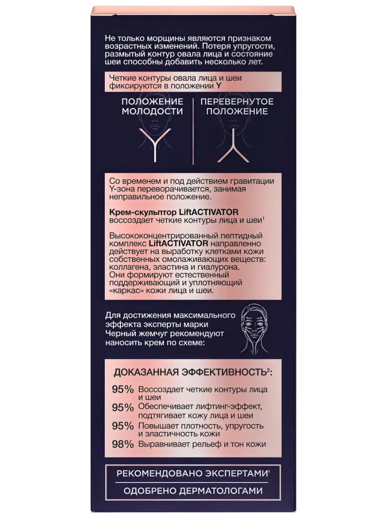 Морщины – не единственный признак старения кожи! В процессе старения Y-зона овала лица и шеи принимает перевернутое положение. Черный Жемчуг нашёл способ вернуть Y-зоне ее исходное положение и разработал крем-скульптор LiftACTIVATOR, который воссоздает четкие контуры лица и шеи*. Почувствуй заметный лифтинг-эффект! Наше время – сейчас! * Укрепляет и подтягивает за счёт синтеза коллагена I-IV-VIII типов, эластина и гиалуроновой кислоты, in-vitro тесты производителя активного ингредиента крема.