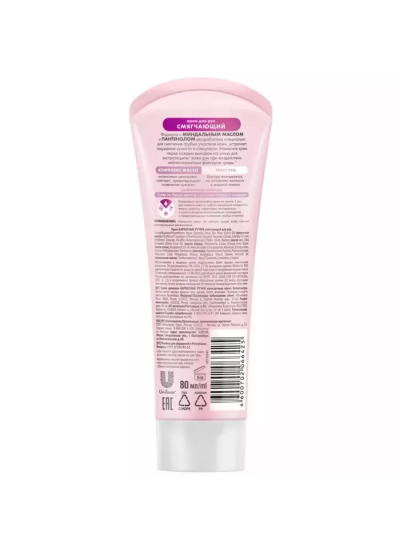 Бренд Бархатные Ручки представляет крем для рук Смягчающий. Насыщенный питательный крем ухаживает за руками, разглаживает кожу, смягчая грубые участки и предотвращая их повторное появление. Дополнительно препятствует появлению заусенцев. Формула Silk Oil Elixir усиливает действие крема. Микромасла восстанавливают клетки кожи и в комплексе с протеинами шелка делают ее мягкой и нежной. Вследствие плотности рогового слоя, кожа ладоней быстро грубеет. Регулярное применение крема для рук, не менее 2-х раз в день, помогает предотвратить появление грубых участков и сохранить мягкость кожи. Формула Silk Oil Elexir представляет собой комплекс, состоящий из микромасел и протеинов шелка. Благодаря своему размеру (до 10 мкм), эти частицы масел способны проникать внутрь эпидермиса, не нарушая липидный барьер, и доставлять питательные вещества клеточкам кожи. МАСЛО КАКАО оказывает смягчающее, заживляющее и тонизирующее действие. Помогает при лечении ожогов, высыпаний на коже. Защищает кожу от обветривания в холодное время года. ГЛИЦЕРИН оказывает смягчающее действие на кожу, увлажняет ее. Небольшие по размеру молекулы глицерина способны преодолевать липидный барьер кожи и проникать в глубокие слои эпидермиса. Исследования показали, что глицерин способствует нормальному процессу жизнедеятельности клеток эпидермиса. МОЧЕВИНА увлажняющий компонент, подходит для сухой, чувствительной кожи. Входит в состав натурального увлажняющего фактора NMF (ряд низкомолекулярных веществ кожи) АЛЛАНТОИН - бесцветное кристаллическое вещество натурального происхождения. Оказывает смягчающее и увлажняющее действие, стимулирует обновление клеток эпидермиса. МАСЛО КУКУРУЗНОЕ обладает антиоксидантным, смягчающим и питательным действием, улучшает цвет лица, используется в средствах по уходу за раздраженной и увядающей кожей. В качестве успокаивающего средства подходит для любого типа кожи, укрепляет естественный барьер кожи, помогает при сухой и шершавой коже. РЕЗУЛЬТАТ: кожа мягкая и нежная!