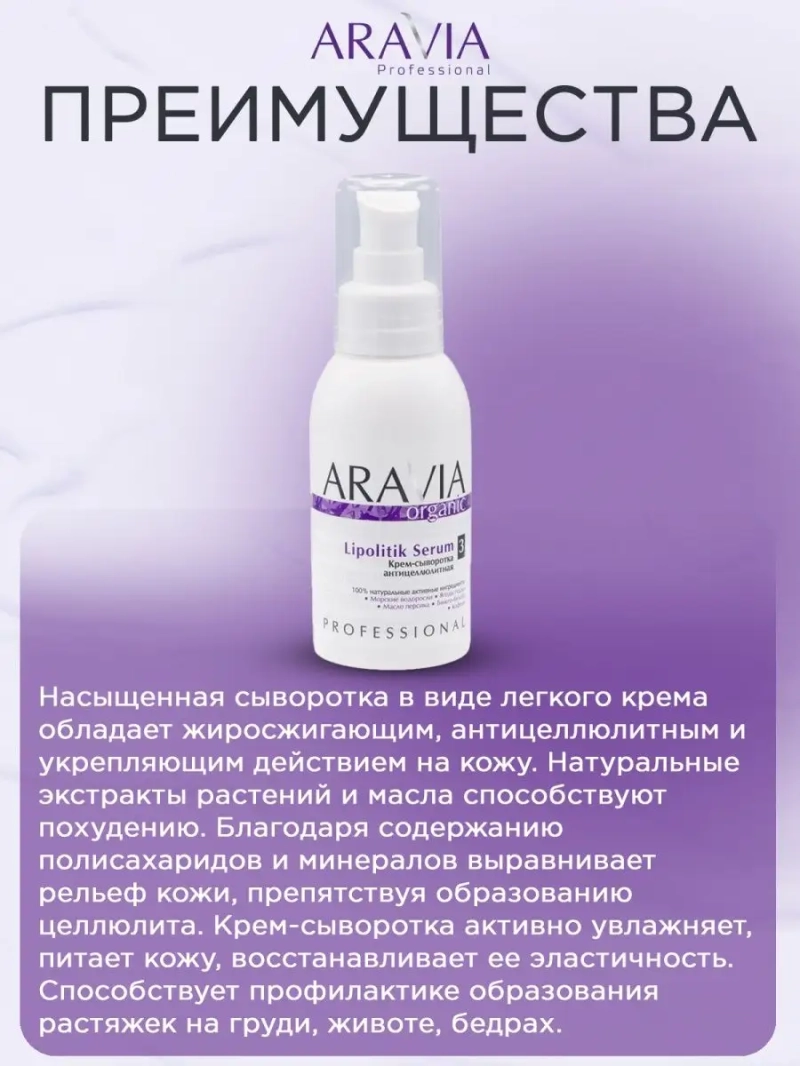 КРЕМ-СЫВОРОТКА АНТИЦЕЛЛЮЛИТНАЯ LIPOLITIK SERUM, 100 МЛ. Насыщенная сыворотка в виде легкого крема обладает жиросжигающим, антицеллюлитным и укрепляющим действием на кожу. Натуральные экстракты растений и масла способствуют похудению. Благодаря содержанию полисахаридов и минералов выравнивает рельеф кожи, препятствуя образованию целлюлита. Крем-сыворотка активно увлажняет, питает кожу, восстанавливает ее эластичность. Способствует профилактике образования растяжек на груди, животе, бедрах. Назначение: рекомендуется применять в процедурах обертывания, массажа (под массажное средство), аппаратных методиках, в качестве регулярного поддерживающего ухода при наличии показаний. Рекомендации для использования: Профессиональный уход (проведение салонных процедур): перед обертыванием, массажем. Может применяться при аппаратных процедурах. Домашний уход (в качестве регулярного поддерживающего ухода): целлюлит 1-4 стадии, локальные жировые отложения, сниженный тургор. ДЕЙСТВИЕ: антицеллюлитное, жиросжигающее, укрепляющее, лифтинговое. Биоактивный состав: морские водоросли (фукус и ламинария), ягоды годжи, масло персика, гинкго-билоба, кофеин, масло сои, экстракт хвоща, экстракт плюща, витамин Е. СПОСОБ ПРИМЕНЕНИЯ: После тщательного глубокого очищения кожи нанесите на корректируемую зону 4–5 капель активной сыворотки. Распределите легкими круговыми и похлопывающими движениями до полного впитывания сыворотки в кожу. Меры предосторожности: не наносите на поврежденную кожу и избегайте попадания в глаза. При попадании в глаза тщательно промойте водой. Перед применением тестируйте на небольшом участке кожи.