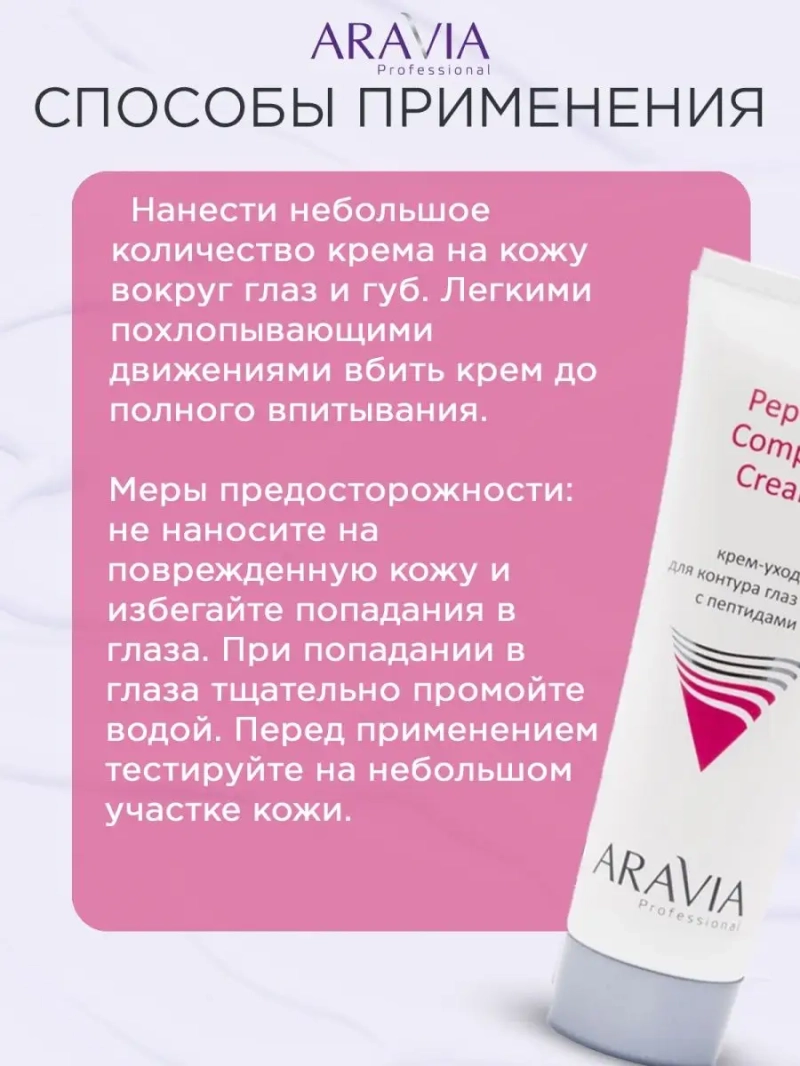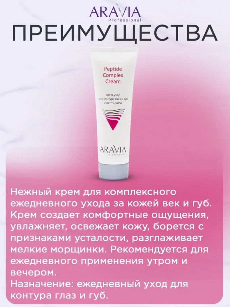 ARAVIA Professional Крем-уход для контура глаз и губ с пептидами – это профессиональный уход за кожей вокруг глаз, который борется с морщинами и признаками старения. Этот крем для глаз содержит пептиды, которые укрепляют кожу и стимулируют производство коллагена, что делает ее более упругой и эластичной. Кроме того, крем для век от морщин содержит троксерутин, который уменьшает отечность и темные круги под глазами. ARAVIA Professional Крем-уход для контура глаз и губ с пептидами - это крем для кожи вокруг глаз против морщин, который также подходит для ухода за кожей вокруг губ. Крем с пептидами является пептидной косметикой от ARAVIA, которая заботится о вашей коже и обеспечивает профессиональный уход. Крем для век от морщин подходит для возрастной кожи и содержит SPF 50, чтобы защитить кожу от вредного воздействия солнечных лучей. ARAVIA Professional Крем-уход для контура глаз и губ с пептидами содержит также виноградную косточку и масло для губ, которые увлажняют и питают кожу, делая ее мягкой и шелковистой. Крем для век с пептидами помогает бороться с морщинами и признаками старения, делая кожу вокруг глаз более упругой и эластичной. ARAVIA Professional Крем-уход для контура глаз и губ с пептидами – это профессиональный уход за кожей от ARAVIA, который поможет вам сохранить молодость и красоту вашей кожи.