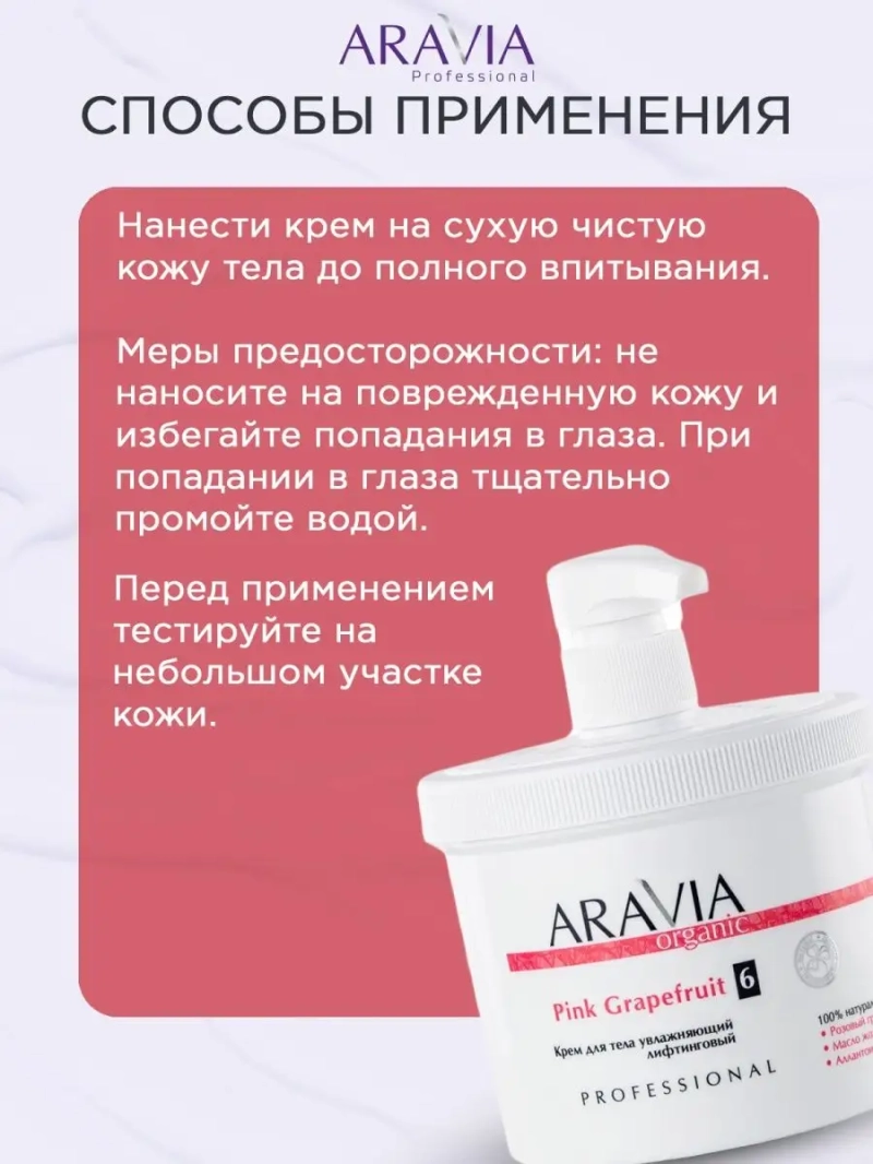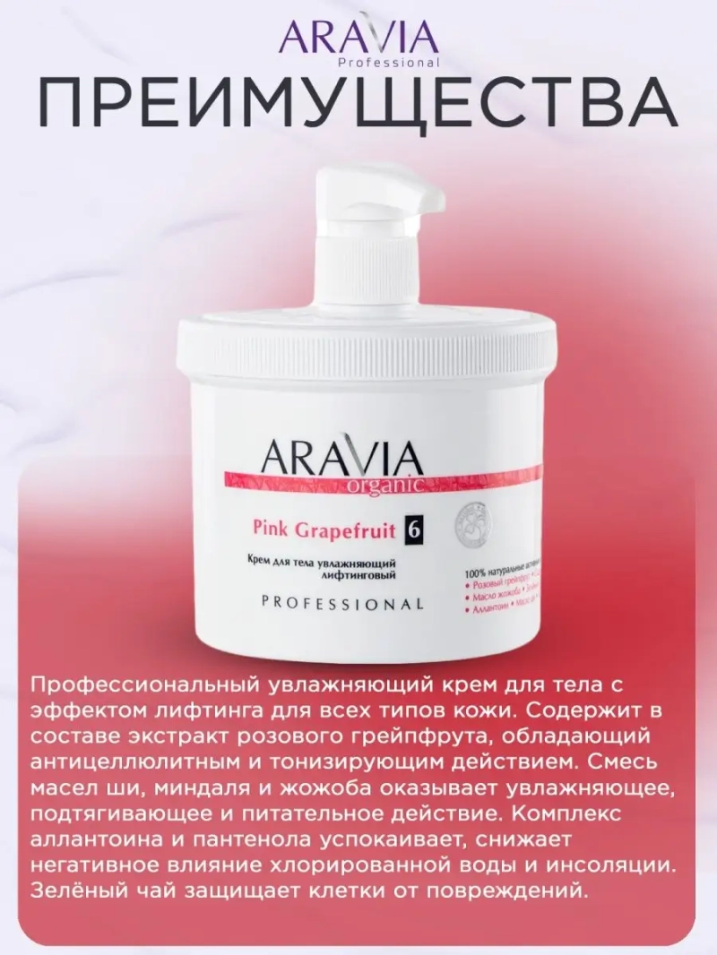 КРЕМ ДЛЯ ТЕЛА УВЛАЖНЯЮЩИЙ ЛИФТИНГОВЫЙ PINK GRAPEFRUIT, 550 МЛ. Профессиональный увлажняющий крем для тела с эффектом лифтинга для всех типов кожи. Содержит в составе экстракт розового грейпфрута, обладающий антицеллюлитным и тонизирующим действием. Смесь масел ши, миндаля и жожоба оказывает увлажняющее, подтягивающее и питательное действие. Комплекс аллантоина и пантенола успокаивает, снижает негативное влияние хлорированной воды и инсоляции. Зелёный чай защищает клетки от повреждений. Ежедневное применение крема снижает проявление возрастных изменений, благоприятно влияет на тургор и эластичность кожи. Назначение: для регулярного ухода после принятия душа, а также в качестве завершающего ухода в профессиональной процедуре. Рекомендации для использования: Профессиональный уход: завершающий этап салонной процедуры. Домашний уход: ежедневное применение 1-2 раза в день. ДЕЙСТВИЕ: антицеллюлитное, увлажняющее, тонизирующее, защитное. Биоактивный состав: розовый грейпфрут (экстракт), масло ши, масло жожоба, масло сладкого миндаля, аллантоин, пантенол, масло сои, зелёный чай (экстракт), сорбитол. Состав продукта (INCI): Aqua, Glycine Soja (Soybean) Oil, C12-15 Alkyl Benzoate, Butylorospermum Parkii (Shea Butter), Potassium Cetyl Phosphate, Trimethylglycine, Glycerin, Prunus Amygdalus Dulcis (Sweet Almond) Oil, Simmondsia Chinensis (Jojoba) Seed Oil, Citrus grandis Extract, Organic Camelia Sinensis Leaf Extract, Panthenol, Allantoin, Sorbitol, Glyceryl Stearate, Cyclopentasiloxane, Sodium Polyacrylate, Phenoxyethanol (and) Ethylhexylglycerin, Parfum. СПОСОБ ПРИМЕНЕНИЯ: Нанести крем на сухую чистую кожу тела до полного впитывания. Меры предосторожности: не наносите на поврежденную кожу и избегайте попадания в глаза. При попадании в глаза тщательно промойте водой. Перед применением тестируйте на небольшом участке кожи.
