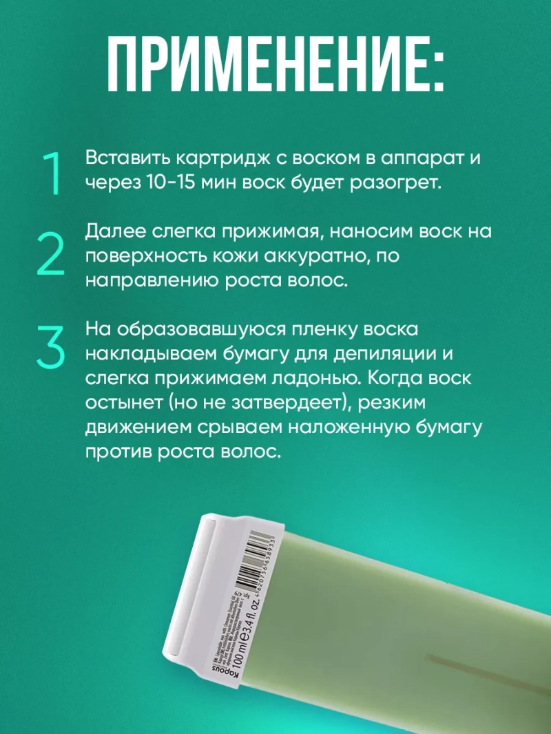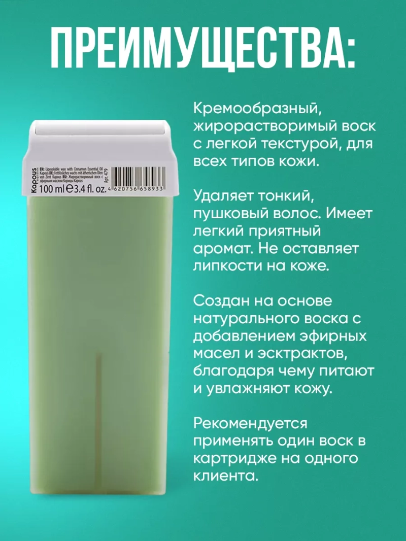 Жирорастворимый воск с маслом Корицы с широким роликом - это идеальное решение для комфортной и эффективной депиляции. Наш воск обладает кремообразной текстурой, которая легко наносится на кожу и мягко удаляет даже самые тонкие и пушковые волосы. Особенностью нашего воска является его жирорастворимость - он легко удаляется с поверхности кожи без оставления липкости. Это позволяет сделать процесс депиляции максимально комфортным и приятным. Наш воск создан на основе натурального воска с добавлением ценных эфирных масел и экстрактов. Благодаря этому, он не только эффективно удаляет волосы, но и питает, увлажняет и смягчает кожу. Каждый наш картридж содержит достаточное количество воска для одной процедуры депиляции. Это удобно и экономично, так как вам не придется покупать дополнительные принадлежности. Композиция воска включает в себя такие компоненты, как Hydrogenated Styrene/Methyl Styrene/Indene Copolymer, Ethylene/VA Copolymer, Hydrogenated Microcrystalline Wax, Paraffin, Paraffinum Liquidum, Titanium Dioxide, Mica, Parfum, Hydroxycitronellal, Linalool, CI 17200, CI 60725. Они не только обеспечивают надежное сцепление воска с волосами, но и придают ему нежный аромат, который оставит вас в приятном состоянии после процедуры. Применение нашего воска очень простое. Вам всего лишь нужно вставить картридж в аппарат и нагреть его в течение 10-15 минут. После этого, с легкостью наносите воск на кожу, следуя направлению роста волос. Закройте обработанную поверхность специальной бумагой для депиляции и надавите ладонью. Когда время полимеризации подойдет, резким движением срежьте бумагу против роста волос. Наш воск с маслом Корицы обещает вам не только эффективную и гладкую депиляцию, но и незабываемый аромат и заботу о вашей коже. Попробуйте его сами и оцените все его преимущества!