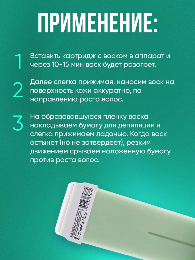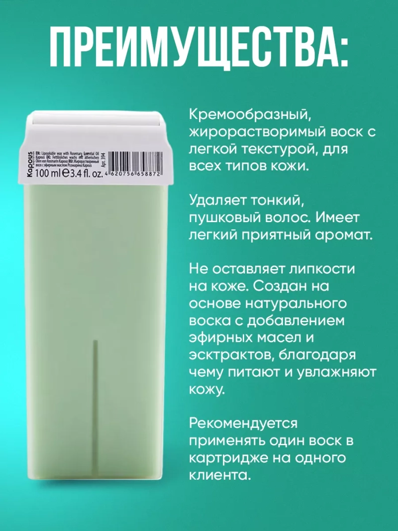 Жирорастворимый воск с маслом Розмарина с широким роликомХотите сделать вашу кожу гладкой и безупречной? Тогда наш кремообразный жирорастворимый воск с маслом Розмарина и широким роликом именно то, что вам нужно! Этот уникальный продукт обладает множеством преимуществ и станет незаменимым помощником в борьбе со нежелательным волосками. Наш воск обладает легкой текстурой, что делает его идеальным для всех типов кожи. Он эффективно удаляет тонкие и пушковые волосы, делая кожу гладкой и шелковистой. Никто не узнает о вашем секрете и нежелательных волосках!Особенностью нашего воска является его приятный аромат, который придаст вам ощущение свежести и комфорта. К тому же, он не оставляет липкости на коже, что делает процедуру депиляции не только эффективной, но и приятной.Наш жирорастворимый воск создан на основе натурального воска с добавлением эфирных масел и экстрактов. Благодаря этому, он питает и увлажняет кожу, делает ее более здоровой и ухоженной. Вы заслуживаете только самое лучшее, поэтому выбирайте наш воск - вы не пожалеете!Каждый картридж с воском рассчитан на одного клиента, что делает использование воска максимально удобным и гигиеничным. Наш продукт обеспечит вам профессиональный результат прямо у вас дома! Все компоненты были тщательно подобраны и обладают только положительными свойствами для вашей кожи.Воспользоваться нашим воском очень просто! Просто вставьте картридж с воском в аппарат и через 10-15 минут он будет разогрет и готов к использованию. Затем, слегка прижимая, аккуратно нанесите воск на поверхность кожи в направлении роста волос. На образовавшуюся пленку воска накладываете бумагу для депиляции и слегка прижимаете ладонью. Когда воск остынет, но не затвердеет, резким движением срываете наложенную бумагу против роста волос. Повторяйте процедуру на других участках кожи и наслаждайтесь гладкостью, которую обеспечивает наш воск!Сделайте замечательный выбор в пользу качества и результативности.