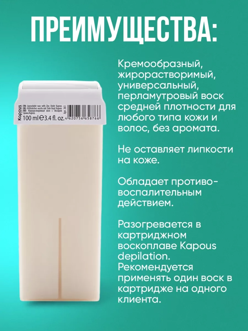 Жирорастворимый воск с Оксидом цинка с широким роликомУниверсальный, кремообразный жирорастворимый воск с Оксидом цинка и широким роликом - идеальное решение для эффективной депиляции любого типа кожи и волос. Уникальная формула воска обеспечивает максимальное сцепление с волосками и минимальные нагрузки на кожу, для результата, который превзойдет все ваши ожидания.Одно из главных преимуществ этого воска - его жирорастворимость. Именно благодаря этому свойству воск легко удаляется с кожи после депиляции, не оставляя неприятных остатков и липкости. Воск имеет перламутровый оттенок, который придает ему элегантный вид. Без запаха, этот воск идеально подходит для использования в салонах красоты, где ароматы могут создавать неудобства для клиентов.За счет противовоспалительного действия воск с Оксидом цинка снижает риск раздражения кожи и покраснения. Это особенно важно для людей, с чувствительной кожей, чтобы обеспечить максимальный комфорт и безопасность во время процедуры депиляции. Для использования воска требуется специальное оборудование - картриджный воскоплав Kapous depilation. Вставьте картридж с воском в воскоплав и через 10-15 минут он будет разогрет до оптимальной температуры. Затем аккуратно и слегка прижимая, нанесите воск на поверхность кожи по направлению роста волос. На нанесенный воск накладывается специальная бумага для депиляции, которую необходимо слегка прижать ладонью. После остывания воска, но до его полного затвердевания, резким движением срывается бумага против роста волос. В результате получается гладкая и нежная кожа без каких-либо следов волосков.Рекомендуется использовать один воскоплавный картридж на каждого клиента, чтобы обеспечить идеальную гигиену и избежать передачи возможных инфекций.