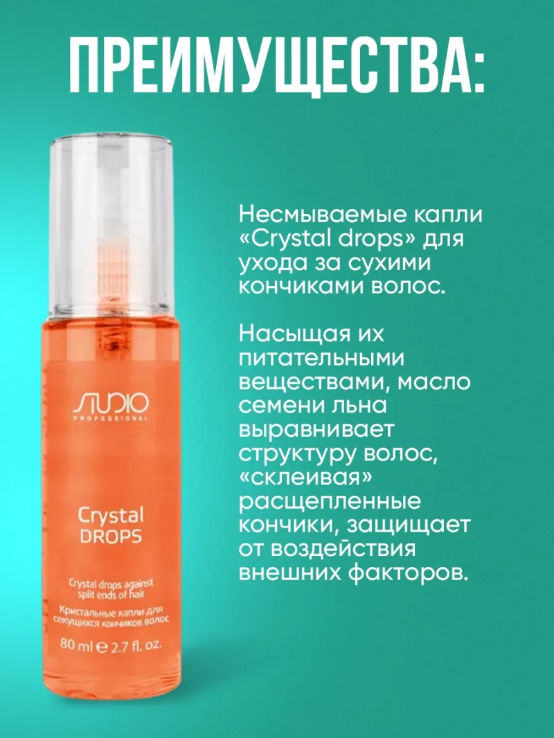 Несмываемые капли Сrystal drops для ухода за сухими кончиками волос. Насыщая их питательными веществами, масло семени льна выравнивает структуру волос, склеивая расщепленные кончики, защищает от воздействия внешних факторов. Активные ингредиенты: масло семени льна. Способ применения: четыре-шесть капель флюида растереть в ладонях, нанести на влажные или сухие волосы от середины к кончикам.... Несмываемые капли Сrystal drops для ухода за сухими кончиками волос. Насыщая их питательными веществами, масло семени льна выравнивает структуру волос, склеивая расщепленные кончики, защищает от воздействия внешних факторов. Активные ингредиенты: масло семени льна. Способ применения: четыре-шесть капель флюида растереть в ладонях, нанести на влажные или сухие волосы от середины к кончикам. Высушить привычным способом.Рейтинг: Товар занимает 1 место в рейтинге сывороток для волос против секущихся кончиков 2023 года