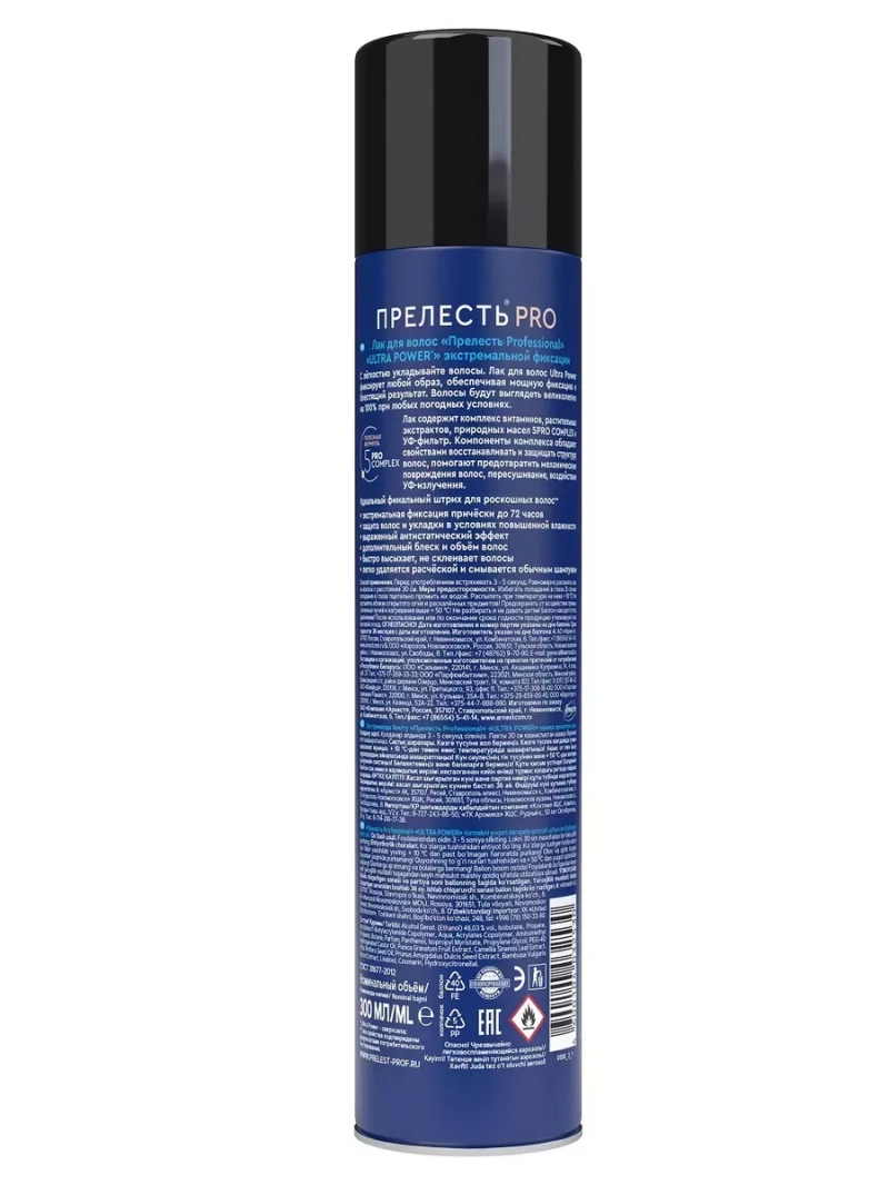 Прелесть Professional «Ultra Power» обеспечивает экстремальную фиксацию на 24 часа. Подходит для волос азиатского типа и создания сложных причесок. Эффективно и надежно фиксирует и защищает укладку даже в условиях повышенной влажности. Укрепляет и предотвращает ломкость волос. Придает волосам блеск и дополнительный объем. Быстро высыхает, не склеивает волосы. Снимает статическое электричество, легко удаляется расческой, не оставляет следов. Защищает от пересушивания и от UV-лучей. Обладает нейтральным ароматом.