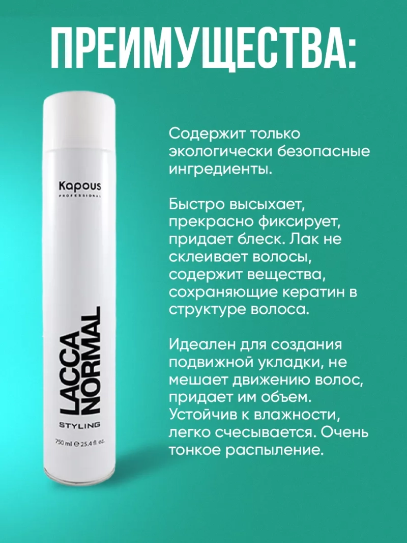 Лак аэрозольный для волос нормальной фиксации "Lacca Normal" содержит только экологически безопасные ингредиенты. Быстро высыхает, прекрасно фиксирует, придает блеск. Лак не склеивает волосы, содержит вещества, сохраняющие кератин в структуре волоса. Идеален для создания подвижной укладки, не мешает движению волос, придает им объем. Устойчив к влажности, легко счесывается. Очень тонкое распыление. Способ применения: хорошо встряхнув, распылять с расстояния 30-40 см от готовой укладки (волосы в движении). Состав: Alcohol denat., Dichloromethane, Butane, Propane, Isobutane, VA/Crotonoates/Vinyl Neodecanoate Copolymer, Isopropyl Alcohol, Methoxyisopropanol, Aminomethyl Propanol, Parfum, Benzyl Alcohol, Limonene, Eugenol, Linalool.