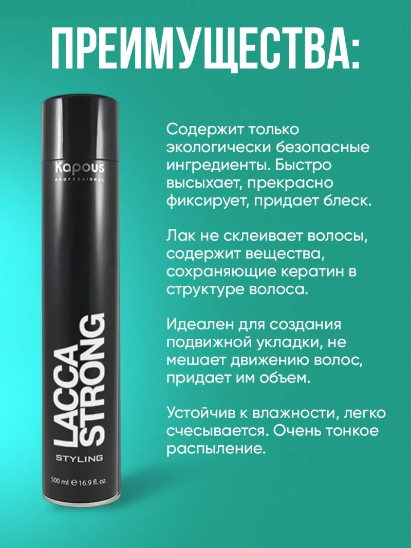 Лак аэрозольный для волос сильной фиксации "Lacca Strong" содержит только экологически безопасные ингредиенты. Быстро высыхает, прекрасно фиксирует, придает блеск. Лак не склеивает волосы, содержит вещества, сохраняющие кератин в структуре волоса. Идеален для создания подвижной укладки, не мешает движению волос, придает им объем. Устойчив к влажности, легко счесывается. Очень тонкое распыление. Способ применения: хорошо встряхнув, распылять с расстояния 30-40 см от готовой укладки (волосы в движении). Состав: Alcohol denat., Dichloromethane, Butane, Propane, Isobutane, Acrylates/T-Butylacrylamide Copolymer, Isopropyl Alcohol, Methoxyisopropanol, Aminomethyl Propanol, Isopropyl Myristate, Parfum, Citronellol, Hexyl Cinnamal, Hydroxycitronellal, Hyroxyisoexyl 3- Ciclohexene Carboxaldehyde, Limonene, Linalool.