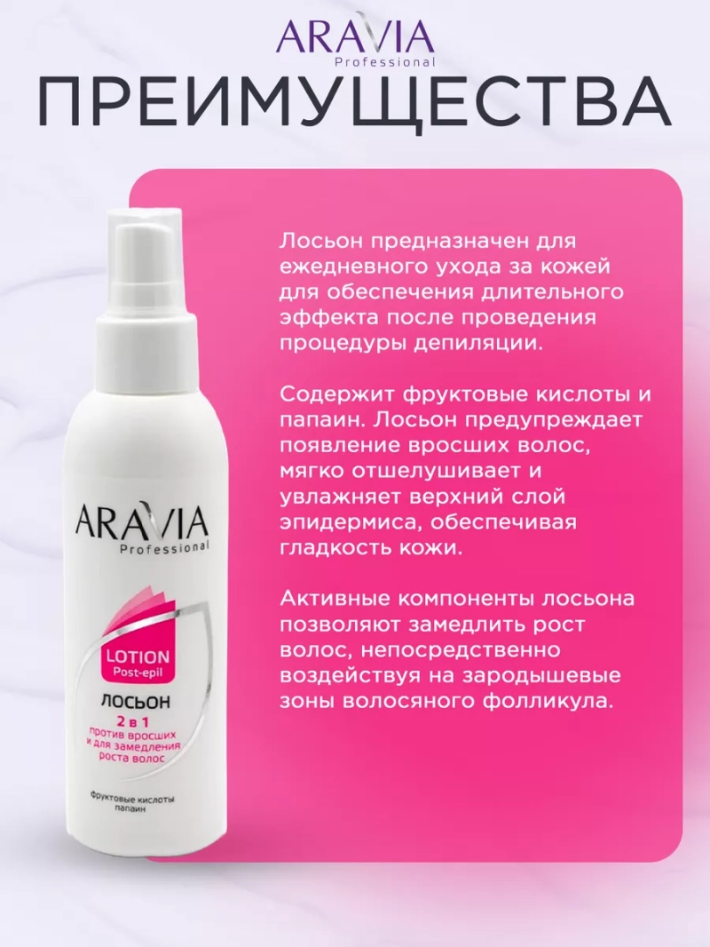 ЛОСЬОН «2 В 1» ПРОТИВ ВРОСШИХ ВОЛОС И ДЛЯ ЗАМЕДЛЕНИЯ РОСТА ВОЛОС, 150 МЛ. Лосьон предназначен для ежедневного ухода за кожей для обеспечения длительного эффекта после проведения процедуры депиляции. Содержит фруктовые кислоты и папаин. Лосьон предупреждает появление вросших волос, мягко отшелушивает и увлажняет верхний слой эпидермиса, обеспечивая гладкость кожи. Активные компоненты лосьона позволяют замедлить рост волос, непосредственно воздействуя на зародышевые зоны волосяного фолликула. Лосьон увеличивает междепиляционный период. Последующие процедуры депиляции становятся менее болезненными. Назначение: межкурсовой уход между процедурами депиляции. Биоактивный состав: экстракт папаина, экстракты фруктовых кислот. Состав продукта (INCI): Aqua, Glycerin, Propylene Glycol, Urea, Papain, PEG-40 Hydrogenated Castor Oil, Parfum, DMDM Hydantoin, Iodopropynyl Butylcarbamate, Tartaric Acid, Glycolic Acid. СПОСОБ ПРИМЕНЕНИЯ: Рекомендуется применять курсом, ежедневно, в течение 10-15 дней, начиная со следующего дня после процедуры депиляции. Распылить небольшое количество лосьона на кожу, распределить до впитывания. Меры предосторожности: не наносите на поврежденную кожу и избегайте попадания в глаза. При попадании в глаза тщательно промойте водой. Перед применением тестируйте на небольшом участке кожи.