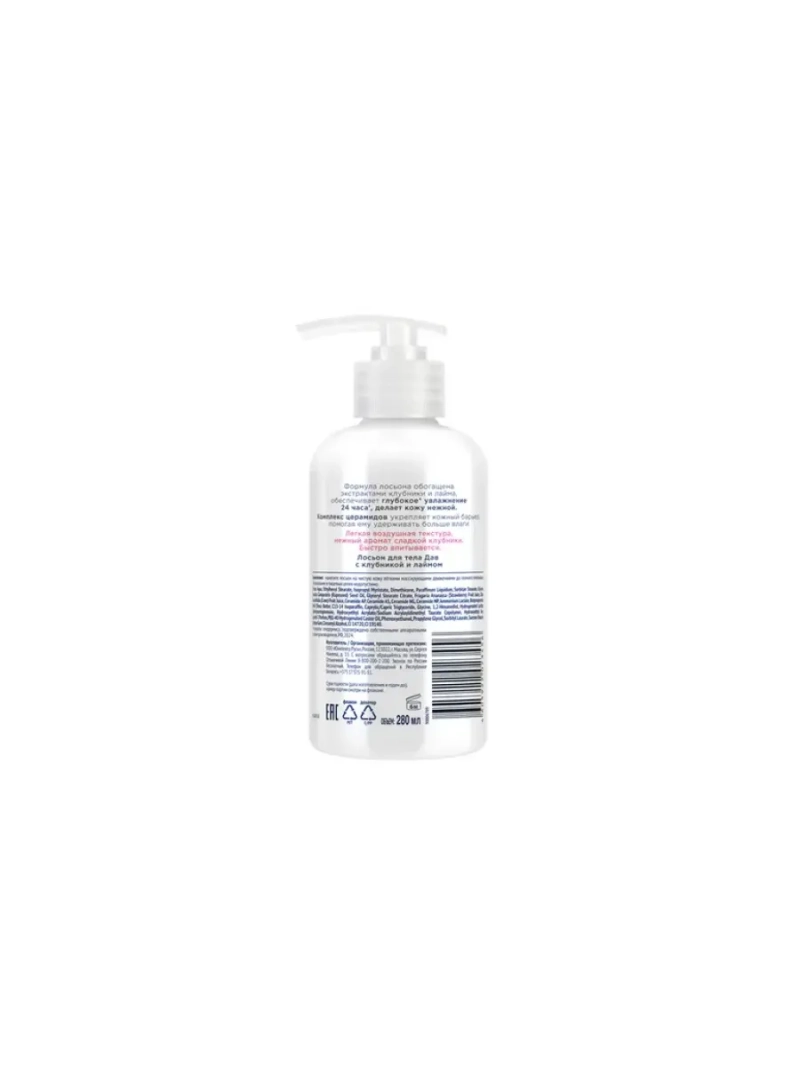 Полное наименование: DOVE лосьон для тела с клубникой и лаймом 280 мл. Производитель: Unilever Россия. Новинка для ухода за телом с нежным ароматом сладкой клубники и легкой текстурой. Крем лосьон для тела с комплексом церамидов, маслом ши, рапсовым маслом и глицерином обеспечивает глубокое’ увлажнение для тела на 24 часа’’ и укрепляет кожный барьер, помогая ему удерживать больше влаги. Средство представлено в формате крема с дозатором. ’в пределах эпидермиса. ’’подтверждено собственными аппаратными тестами производителя, РФ, 2024.