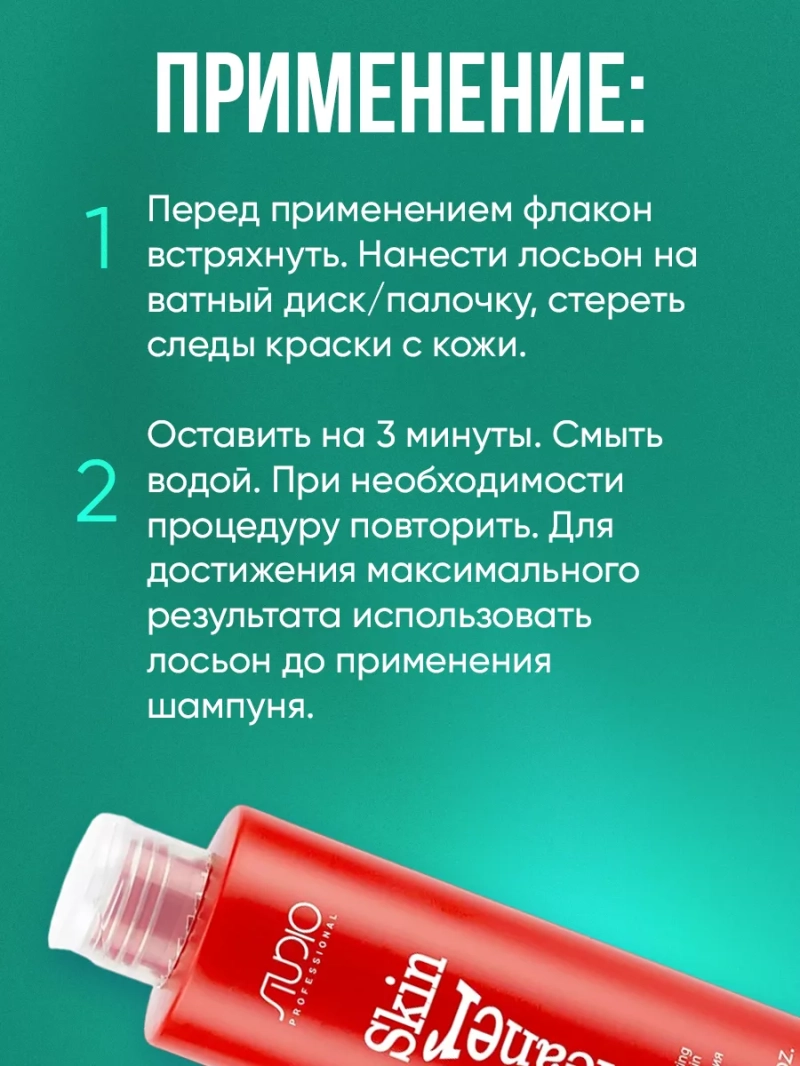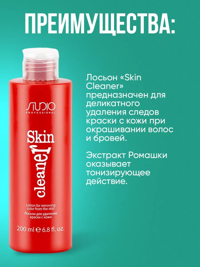 Лосьон Skin Cleaner предназначен для деликатного удаления следов краски с кожи при окрашивании волос и бровей. Экстракт Ромашки оказывает тонизирующее действие. Лосьон Skin Cleaner предназначен для деликатного удаления следов краски с кожи при окрашивании волос и бровей. Экстракт Ромашки оказывает тонизирующее действие. Состав: AQUA (WATER), ALCOHOL DENAT, METHOXYISOPROPANOL, PROPYLENE GLYCOL BUTYL ETHER, DECETH-8, TRIETHANOLAMINE, TETRASODIUM EDTA, SODIUM BORATE,PROPYLENE GLYCOL, CHAMOMILLA RECUTITA (MATRICARIA) FLOWER EXTRACT, SUBTILISIN, BORIC ACID. Активные ингредиенты: РомашкаРомашка обладает выраженным дезинфицирующим, противовоспалительным и антисептическим действием.Способ применения: Перед применением флакон встряхнуть. Нанести лосьон на ватный диск/палочку, стереть следы краски с кожи. Оставить на 3 минуты. Смыть водой. При необходимости процедуру повторить. Для достижения максимального результата использовать лосьон до применения шампуня. Меры предосторожности: При попадании смеси в глаза тщательно промыть их водой. Плотно закрывать упаковку после каждого использования. Хранить в сухом, прохладном, не доступном для детей месте.