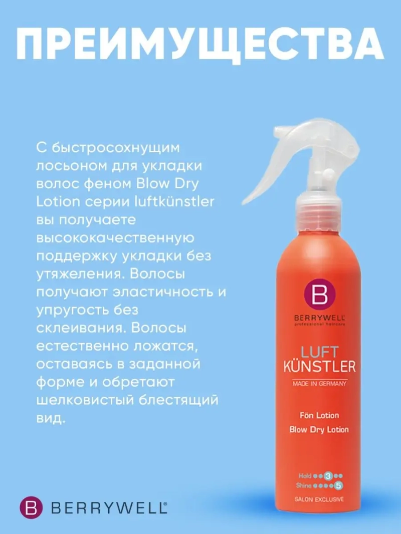 Лосьон для укладки волос феном BLOW DRY LOTION. Поддержка в искусстве создания объема без утяжеления. С быстросохнущим лосьоном для укладки волос феном Blow Dry Lotion серии luftkünstler вы получаете высококачественную поддержку укладки без утяжеления. Волосы получают эластичность и упругость без склеивания. Волосы естественно ложатся, оставаясь в заданной форме и обретают шелковистый блестящий вид. Способ применения: распылить необходимое количество на влажные волосы и создать желаемый образ. Меры предосторожности: избегать попадания в глаза. В случае попадания тщательно промыть водой. Если симптомы сохраняться, проконсультироваться с врачом. Эксклюзивно для парикмахерских салонов.