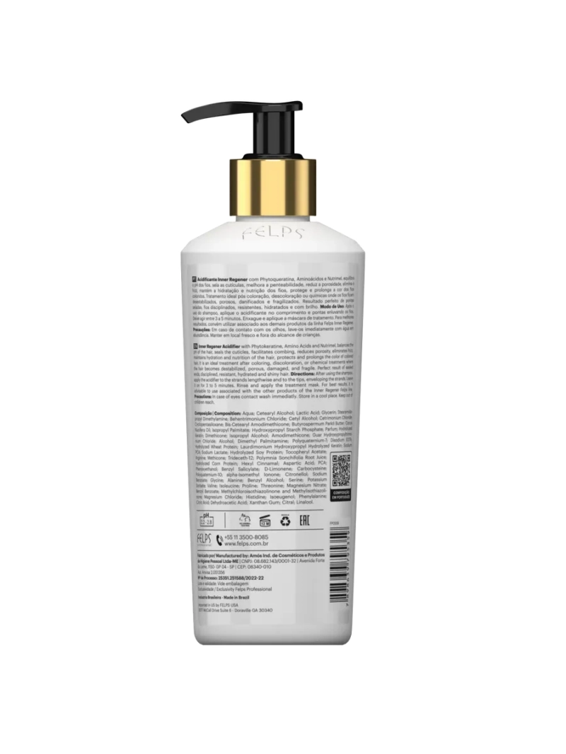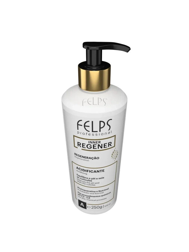 Кислотный Активатор Felps Professional Inner Regener Regeneration Acidifying балансирует pH прядей, уплотняет кутикулу, улучшает расчесываемость, уменьшает пористость, устраняет пушение, поддерживает увлажнение и питание прядей, защищает и продлевает цвет окрашенных прядей. Идеально подходит после окрашивания, обесцвечивания или химической обработки, когда волосы становятся дестабилизированными, пористыми, поврежденными и хрупкими. Прекрасный результат - запечатанные кончики, послушные и стойкие волосы, увлажненные и блестящие. Продлевает увлажнение, предотвращает сухость, пористость, повреждения и секущиеся кончики, вызванные химическими процессами и термическим нагревом. В состав входит Ácido Hialurônico. Он выполняет двойную функцию - заполняет пространства между клетками, одновременно защищая их и борясь со свободными радикалами. Богат питательными веществами и витаминами А, В и С, которые восстанавливают и восполняют массу, структурируя внутреннюю часть волокна поврежденных волос, способствуя длительному блеску. Аминокислоты способствуют различным полезным эффектам, таким как увлажнение, укрепление структуры, защита цвета и устранение поверхностных повреждений. Улучшает чувствительность сухих волос (расчесываемость, мягкость и шелковистость), улучшает чувствительность влажных волос (расчесываемость, мягкость) и дольше сохраняет цвет окрашенных волос. Хорошее средство для роста волос и для кожи головы. Укрепляет корни волос, помогает остановить выпадение и ускорить рост волос, смягчает и увлажняет волосы, придает им силу и поддерживает естественный блеск.Применение: После использования шампуня нанесите активатор на длину и концы волос, склеивая их. Оставьте на 3-5 минут. Смойте и нанесите маску Regener Inner Felps.
