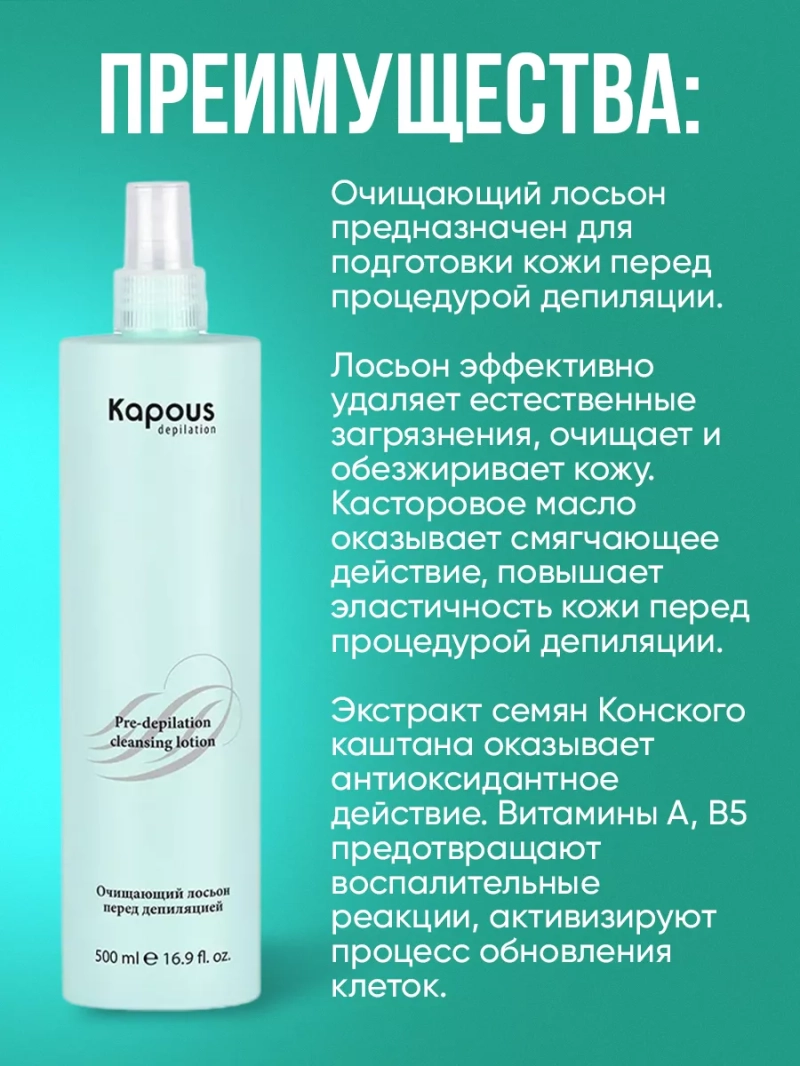 Хотите иметь гладкую и нежную кожу после депиляции? Тогда обязательно познакомьтесь с нашим инновационным очищающим лосьоном перед депиляцией! Наш лосьон не просто очищает кожу, но и заботится о ней, предотвращая аллергические реакции и дерматиты. Витамин В5, который содержится в составе, обладает детоксицирующими свойствами, так что вы можете жить спокойно, зная, что ваша кожа будет в полной безопасности. А Витамин А смягчает и увлажняет кожу, повышая ее эластичность и активизируя процесс обновления клеток. Насыщенная формула лосьона включает в себя такие компоненты, как AQUA, PROPYLENE GLYCOL, PEG-40 HYDROGENATED CASTOR OIL, ETHOXYDIGLYCOL и другие, которые работают в симбиозе, чтобы достичь максимального результата. Бережно и надежно очищая кожу, лосьон создает идеальную основу для депиляции. Способ применения легок и удобен. Просто нанесите продукт на депилируемые участки кожи и массирующими движениями равномерно распределите. После этого осушите кожу и приступайте к депиляции. Ощутите разницу уже после первого использования! Этот уникальный лосьон призван стать вашим незаменимым помощником в поддержании красоты и здоровья вашей кожи. Добейтесь максимальных результатов, доверившись надежности и качеству нашего продукта.Закажите очищающий лосьон перед депиляцией прямо сейчас и наслаждайтесь гладкой и шелковистой кожей каждый день! Не упустите возможность приобрести этот прекрасный продукт по самой выгодной цене.