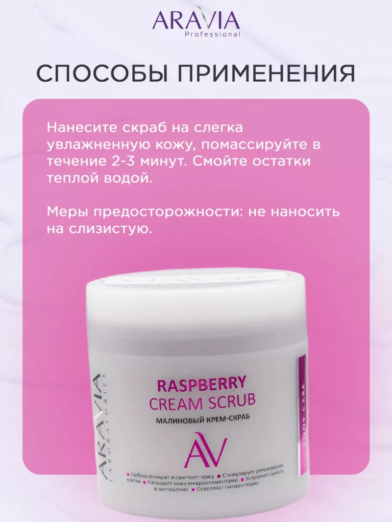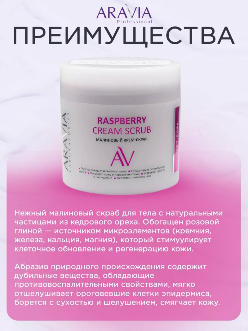 МАЛИНОВЫЙ КРЕМ-СКРАБ RASPBERRY CREAM SCRUB, 300 МЛ. Нежный малиновый скраб для тела с натуральными частицами из кедрового ореха. Обогащен розовой глиной — источником микроэлементов (кремния, железа, кальция, магния), который стимуулирует клеточное обновление и регенерацию кожи. Абразив природного происхождения содержит дубильные вещества, обладающие противовоспалительными свойствами, мягко отшелушивает ороговевшие клетки эпидермиса, борется с сухостью и шелушением, смягчает кожу. Богатая полифенолами и органическими кислотами вытяжка из малины обладает антиоксидантным действием, освежает кожу и осветляет пигментные пятна. Скраб разглаживает и выравнивает поверхность кожи, оставляет на теле легкий приятный запах летних ягод. Назначение: глубокое очищение, отшелушивание. Рекомендации для использования: рекомендуется использовать 1-2 раза в неделю. Экстракт малины смягчает, питает и разглаживает кожу, способствует нормализации внутриклеточного обмена и омоложению кожи. Помогает поддерживать кожу в тонусе, увлажняет кожу, делает ее более упругой. Осветляет пигментацию. Розовая глина улучшает цвет кожи, смягчает, тонизирует. Увлажняет кожу, разглаживает рельеф. Насыщает кожу микроэлементами. Устраняет сухость и шелушение. Каолин вытягивает излишки кожного сала и загрязнения, контролирует работу сальных желез, оказывает бактерицидное, противовоспалительное действие. Обладает мягким отшелушивающим действием, стимулирует регенерацию клеток и насыщает их кислородом, способствует образованию коллагена, придающего тканям эластичность. Скорлупа кедрового ореха скрабирующие частицы, очищают и отшелушивают кожу. Масло сои источник лецитина и витаминов. Увлажняет, смягчает кожу, замедляет процесс увядания. Восстанавливает защитный эпидермальный барьер и влагоудерживающую способность кожи. СПОСОБ ПРИМЕНЕНИЯ: Нанесите скраб на слегка увлажненную кожу, помассируйте в течение 2-3 минут. Смойте остатки теплой водой. Меры предосторожности: не наносить на слизистую.