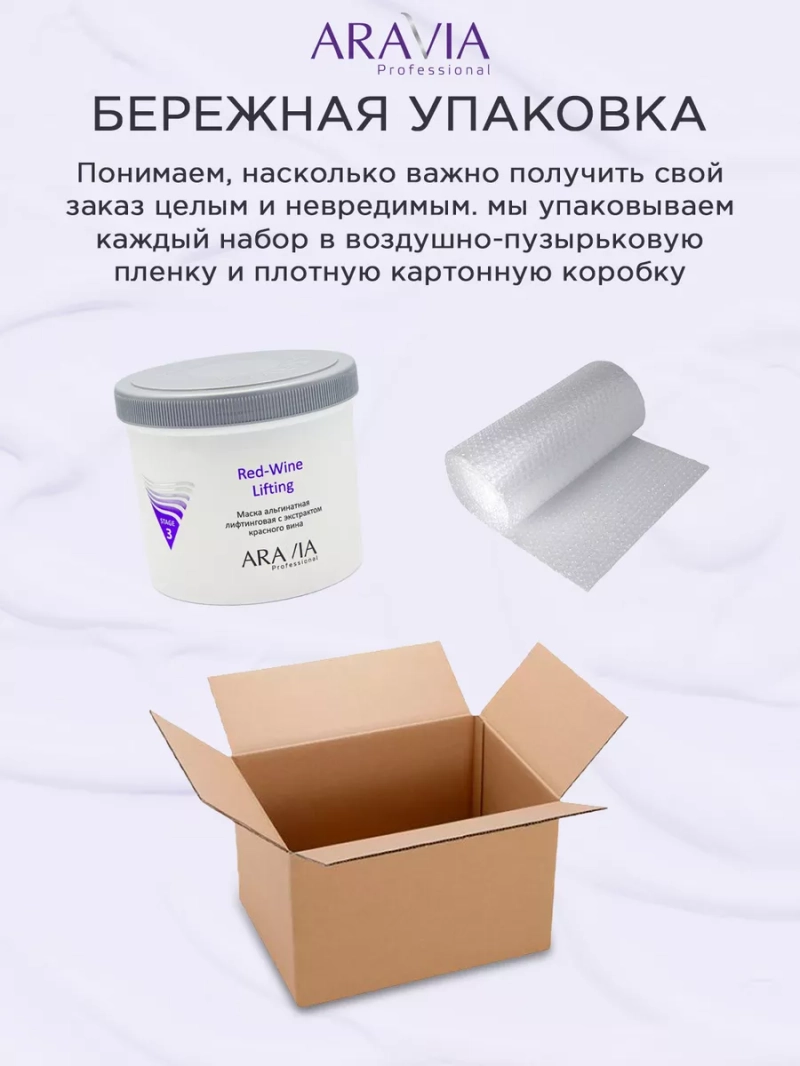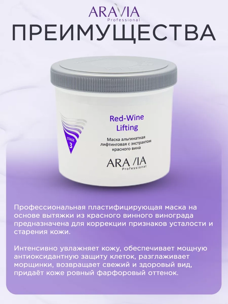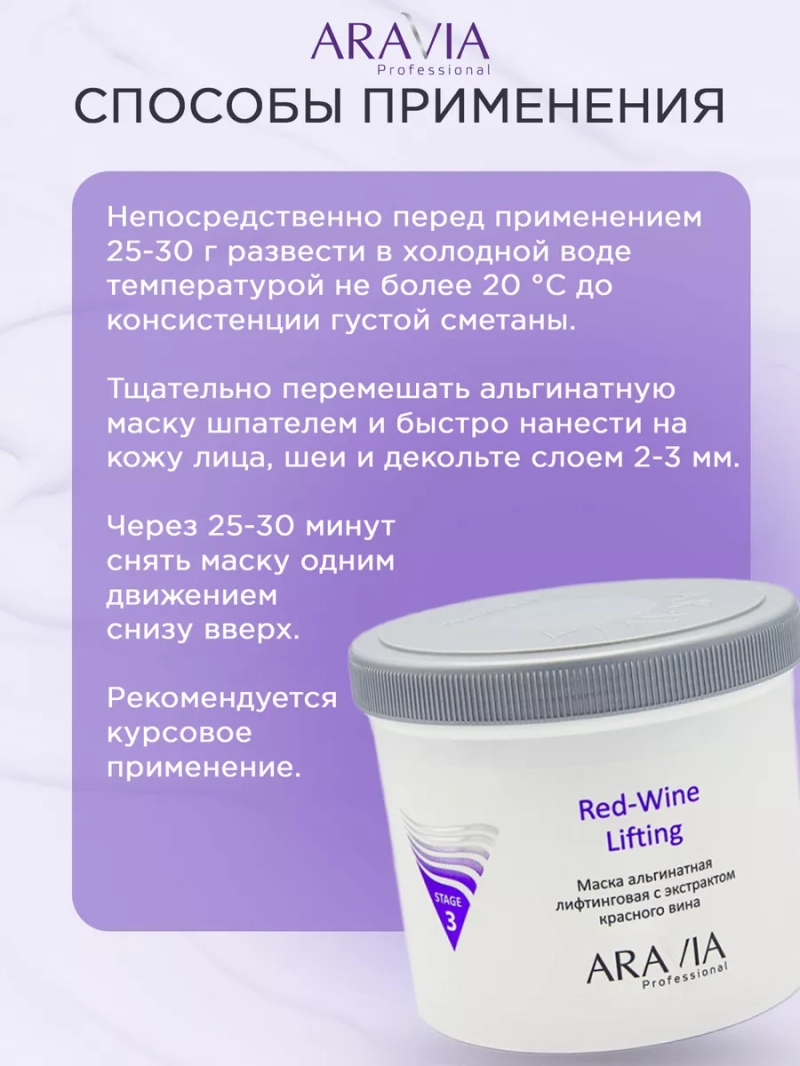 МАСКА АЛЬГИНАТНАЯ ЛИФТИНГОВАЯ RED-WINE LIFTING С ЭКСТРАКТОМ КРАСНОГО ВИНА, 550 МЛ. Профессиональная пластифицирующая маска на основе вытяжки из красного винного винограда предназначена для коррекции признаков усталости и старения кожи. Интенсивно увлажняет кожу, обеспечивает мощную антиоксидантную защиту клеток, разглаживает морщинки, возвращает свежий и здоровый вид, придаёт коже ровный фарфоровый оттенок. Экстракты морских водорослей насыщают клетки кожи минералами, увлажняют, повышают упругость и эластичность, способствуют нормализации процесса регенерации. Выраженное компрессионное воздействие маски обеспечивает дополнительный лимфодренаж, способствует снятию отёчности, моделирует овал лица. Назначение: для возрастной, сухой, уставшей кожи, а также для восстановления кожи после интенсивных процедур и инсоляции. Рекомендации для использования: завершающий этап интенсивного ухода или самостоятельная процедура. ДЕЙСТВИЕ: увлажняющее, лимфодренажное, подтягивающее, профилактика возрастных изменений. Биоактивный состав: диатомовая земля, альгинаты, красный винный виноград, морские водоросли.Состав продукта (INCI): Diatomaceous Earth, Sodium Alginate, Calcium Sulphate, Sodium Pyrophosphate, Vitis Vinifera (Grape) Extract, Laminaria saccharina Extract, Perfume. СПОСОБ ПРИМЕННЕНИЯ: Непосредственно перед применением 25-30 г развести в холодной воде температурой не более 20 °С до консистенции густой сметаны. Тщательно перемешать альгинатную маску шпателем и быстро нанести на кожу лица, шеи и декольте слоем 2-3 мм. Через 25-30 минут снять маску одним движением снизу вверх. Рекомендуется курсовое применение. Меры предосторожности: не наносите на поврежденную кожу и избегайте попадания в глаза. При попадании в глаза тщательно промойте водой. Перед применением тестируйте на небольшом участке кожи.