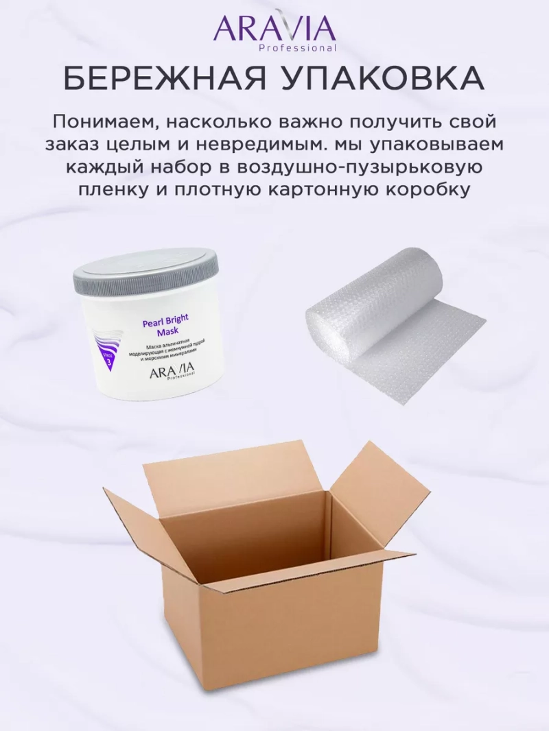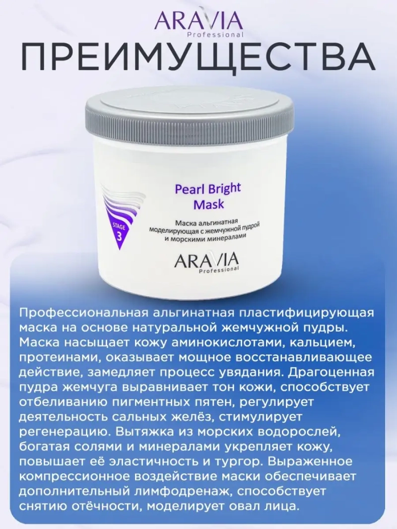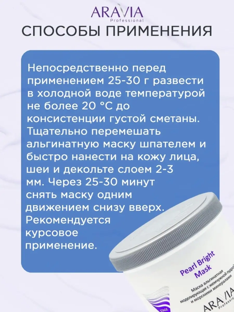 МАСКА АЛЬГИНАТНАЯ МОДЕЛИРУЮЩАЯ PEARL BRIGHT MASK С ЖЕМЧУЖНОЙ ПУДРОЙ И МОРСКИМИ МИНЕРАЛАМИ, 550 МЛ. Профессиональная альгинатная пластифицирующая маска на основе натуральной жемчужной пудры. Маска насыщает кожу аминокислотами, кальцием, протеинами, оказывает мощное восстанавливающее действие, замедляет процесс увядания. Драгоценная пудра жемчуга выравнивает тон кожи, способствует отбеливанию пигментных пятен, регулирует деятельность сальных желёз, стимулирует регенерацию. Вытяжка из морских водорослей, богатая солями и минералами укрепляет кожу, повышает её эластичность и тургор. Выраженное компрессионное воздействие маски обеспечивает дополнительный лимфодренаж, способствует снятию отёчности, моделирует овал лица. Назначение: восстановление и насыщение кожи. Замедление процесса старения. Для всех типов кожи. Рекомендации для использования: завершающий этап интенсивного ухода или самостоятельная процедура. ДЕЙСТВИЕ: увлажняющее, лимфодренажное, осветляющее, подтягивающее, коррекция возрастных изменений. Биоактивный состав: диатомовая земля, альгинаты, жемчужная пудра, морские водоросли, рис, витамин С. Состав продукта (INCI): Diatomaceous Earth, Sodium Alginate, Calcium Sulphate, Sodium Pyrophosphate, Superfine Pearl Powder, Rice Powder, Vitamin C, Laminaria saccharina Еxtract, Maris Salt, Perfume, CI 77891. СПОСОБ ПРИМЕННЕНИЯ: Непосредственно перед применением 25-30 г развести в холодной воде температурой не более 20 °С до консистенции густой сметаны. Тщательно перемешать альгинатную маску шпателем и быстро нанести на кожу лица, шеи и декольте слоем 2-3 мм. Через 25-30 минут снять маску одним движением снизу вверх. Рекомендуется курсовое применение. Меры предосторожности: не наносите на поврежденную кожу и избегайте попадания в глаза. При попадании в глаза тщательно промойте водой. Перед применением тестируйте на небольшом участке кожи.
