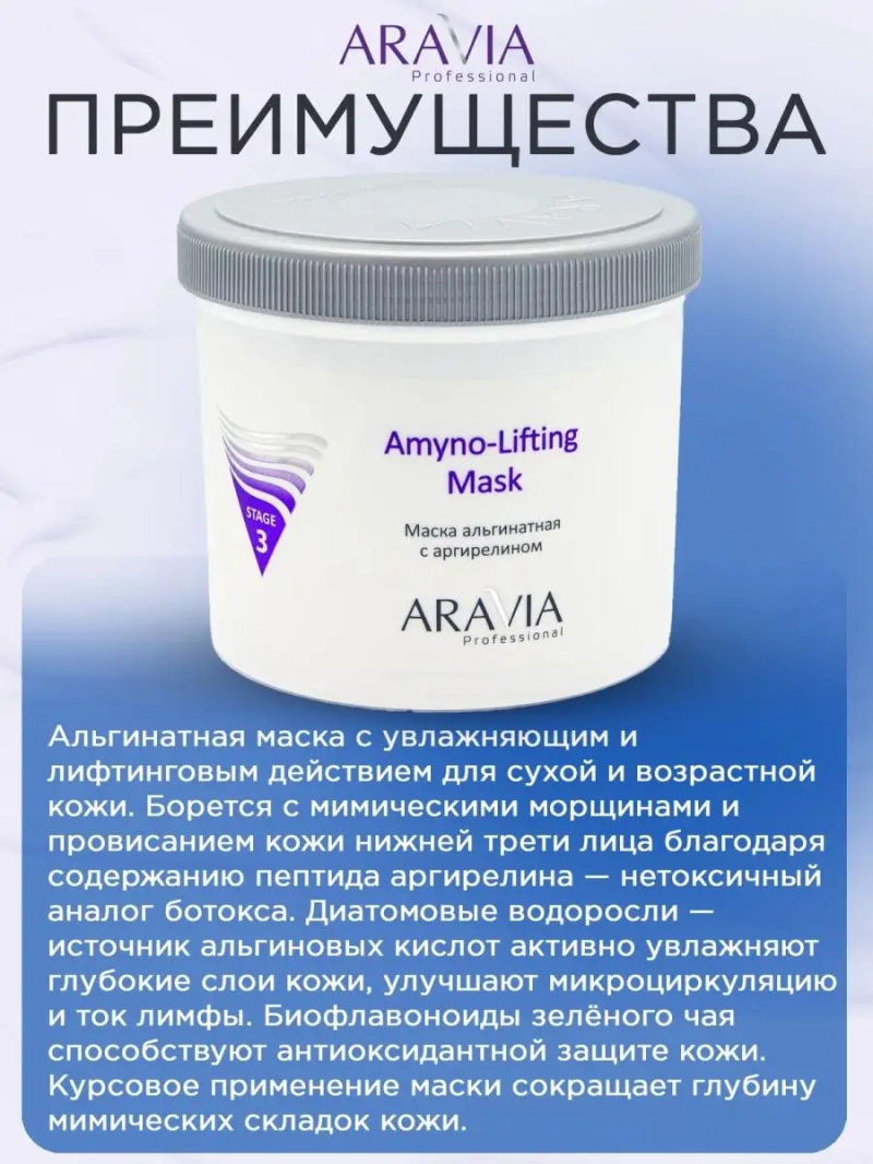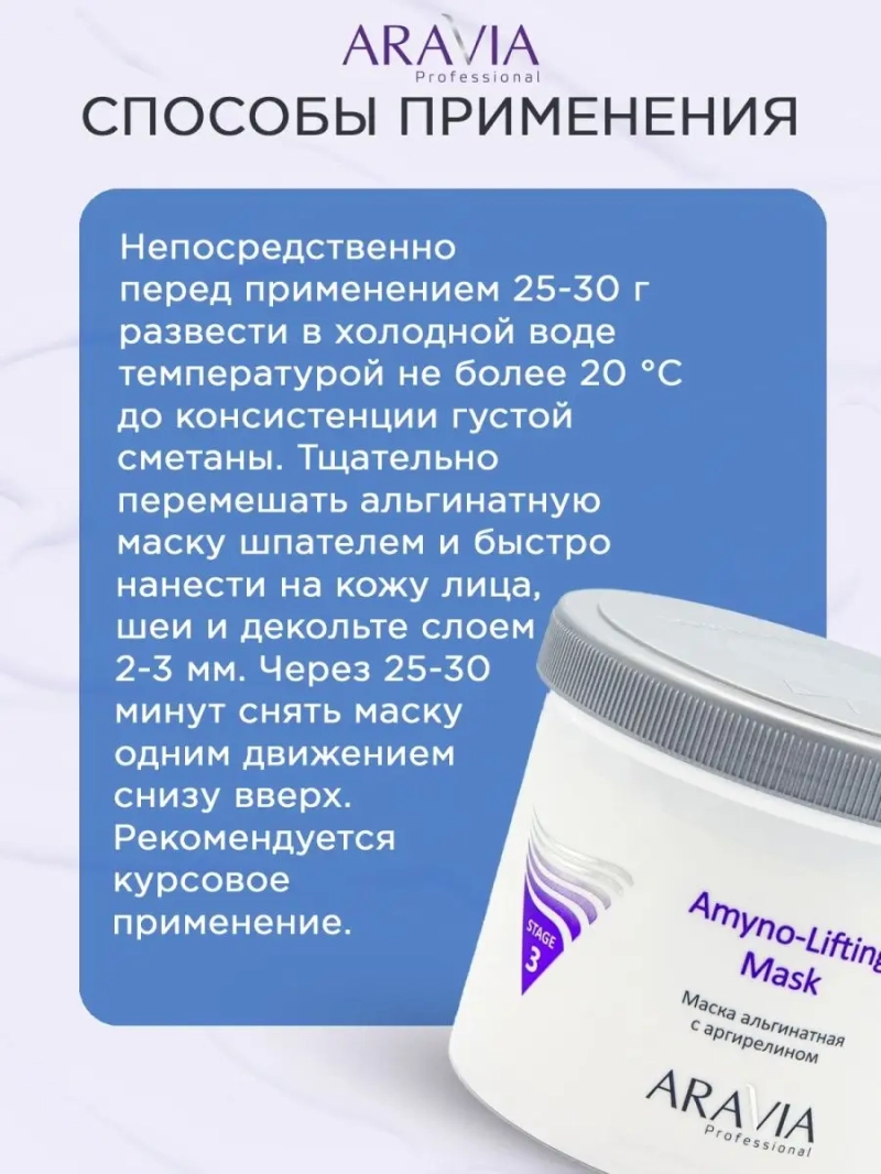 МАСКА АЛЬГИНАТНАЯ С АРГИРЕЛИНОМ AMYNO-LIFTING, 550 МЛ. Альгинатная маска с увлажняющим и лифтинговым действием для сухой и возрастной кожи. Борется с мимическими морщинами и провисанием кожи нижней трети лица благодаря содержанию пептида аргирелина — нетоксичный аналог ботокса. Диатомовые водоросли — источник альгиновых кислот активно увлажняют глубокие слои кожи, улучшают микроциркуляцию и ток лимфы. Биофлавоноиды зелёного чая способствуют антиоксидантной защите кожи. Курсовое применение маски сокращает глубину мимических складок кожи, расслабляет мышцы под глазами, «гусиные лапки», на лбу и в носогубной складке, сохраняя при этом естественную мимику лица. Назначение: профессиональная маска для лица и шеи для сухой и возрастной кожи. Рекомендации для использования: завершающий этап интенсивного ухода или самостоятельная процедура. ДЕЙСТВИЕ: увлажняющее, лимфодренажное, осветляющее, подтягивающее, профилактика возрастных изменений. Биоактивный состав: диатомовая земля, альгинаты, аргирелин, зелёный чай. Состав продукта (INCI): Diatomaceous Earth, Sodium Alginate, Calcium Sulphate, Sodium Pyrophosphate, Camellia sinensis extract, Acetyl hexa-peptide-8, Perfume. СПОСОБ ПРИМЕННЕНИЯ: Непосредственно перед применением 25-30 г развести в холодной воде температурой не более 20 °С до консистенции густой сметаны. Тщательно перемешать альгинатную маску шпателем и быстро нанести на кожу лица, шеи и декольте слоем 2-3 мм. Через 25-30 минут снять маску одним движением снизу вверх. Рекомендуется курсовое применение. Меры предосторожности: не наносите на поврежденную кожу и избегайте попадания в глаза. При попадании в глаза тщательно промойте водой. Перед применением тестируйте на небольшом участке кожи.