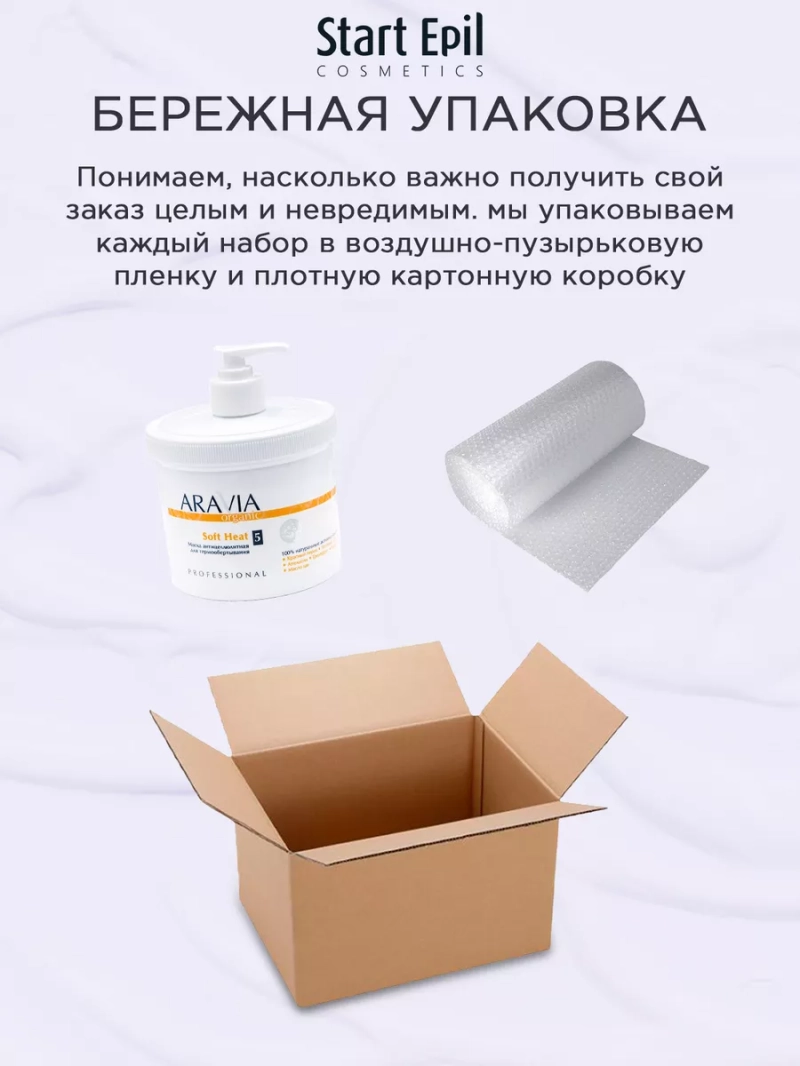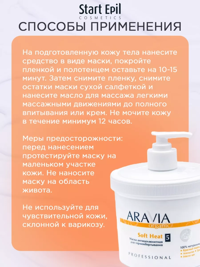МАСКА АНТИЦЕЛЛЮЛИТНАЯ ДЛЯ ТЕРМООБЕРТЫВАНИЯ SOFT HEAT, 550 МЛ. Антицеллюлитная маска для кожи тела с мягким термоактивным эффектом. Высокоактивный натуральный комплекс органических экстрактов растений ускоряет обменные процессы, выводит токсины и избыточную жидкость, позволяет значительно уменьшить проявления целлюлита. Насыщает кожу минералами и витаминами, оказывает укрепляющее и подтягивающее действие. Назначение: ускорение обменных процессов, выведение токсинов и избыточной жидкости. Рекомендации для использования: Профессиональный уход: процедура обертывания. ДЕЙСТВИЕ: антицеллюлитное, жиросжигающее, укрепляющее, подтягивающее. Биоактивный состав: красный перец, зелёный чай, имбирь, апельсин, грейпфрут, витамины А и Е, масло ши, кофеин, ментол. Состав продукта (INCI): Aqua, Glycerin, Caprylic/Capric Triglyceride, Cetearyl Alcohol, Potassium Cetyl Phosphate, Butylorospermum Parkii (Shea Butter), Glyceryl Stearate, Ceteareth-20, Caffeine, Urea, Organic Lycium Barbarum Fruit Extract, Organic Camelia Sinensis Leaf Extract, Taraxacum Officinale (Dandelion) Extract, Hedera Helix (Ivy) Extract, Organic Citrus Grandis Extract, Organic Citrus Aurantium Dulcis Fruit Extract, Organic Zingiber Officinale (Ginger) Root Extract, Capsicum Annuum Extract, Parfum, Sodium Polyacrylate, ВНТ, Tocopheryl Acetate, Phenoxyethanol (and) Methylparaben (and) Ethylparaben, Propylparaben. СПОСОБ ПРИМЕНЕНИЯ: На подготовленную кожу тела нанесите средство в виде маски, покройте пленкой и полотенцем оставьте на 10-15 минут. Затем снимите пленку, снимите остатки маски сухой салфеткой и нанесите масло для массажа легкими массажными движениями до полного впитывания или крем. Не мочите кожу в течение минимум 12 часов. Меры предосторожности: перед нанесением протестируйте маску на маленьком участке кожи. Не наносите маску на область живота. Для достижения максимального результата рекомендуется сочетать уход с другими профессиональными средствами линии ARAVIA Organic.